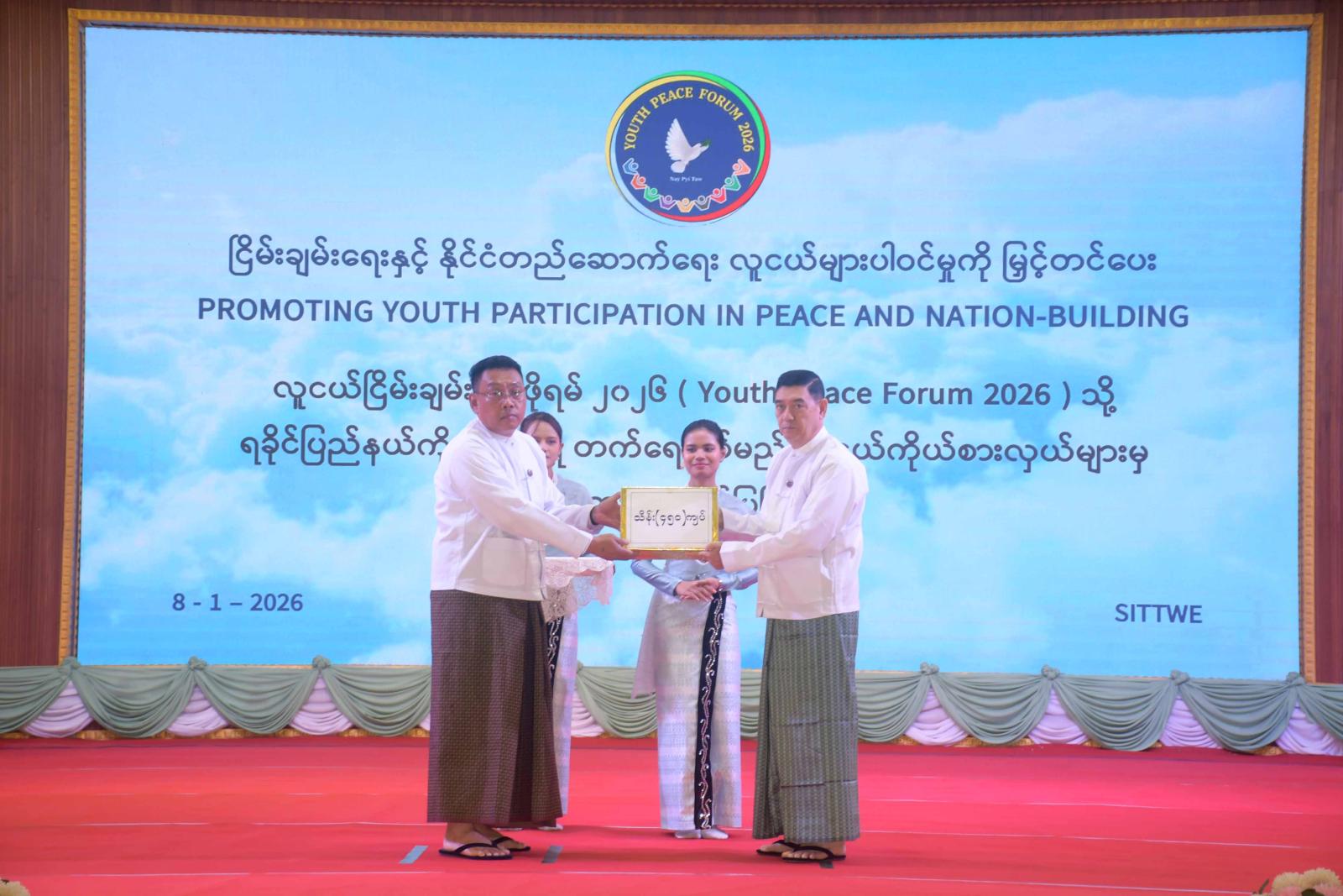 လူငယ်ငြိမ်းချမ်းရေးဖိုရမ် ၂၀၂၆ (Youth Peace Forum 2026) သို့ ရခိုင်ပြည်နယ် ကိုယ်စားပြု တက်ရောက်ကြမည့် လူငယ်ကိုယ်စားလှယ်များမှ ဆွေးနွေးတင်ပြခြင်း အခမ်းအနားကို ယနေ့နံနက်ပိုင်းက စစ်တွေမြို့၊ ဦးဥတ္တမခန်းမ၌ကျင်းပရာ ရခိုင်ပြည်နယ်ဝန်ကြီးချုပ် ဦးထိန်လင်းနှင့်ဇနီး ပြည်နယ်အမျိုးသမီးရေးရာအဖွဲ့နာယက ဒေါ်ဆွေဆွေမြတ်၊ ပြည်နယ်တရားလွှတ်တော်တရားသူကြီးချုပ်၊ ပြည်နယ်အစိုးရအဖွဲ့ဝင်များ၊ ဌာနဆိုင်ရာများ၊ လူငယ်ကိုယ်စားလှယ်များ၊ တက္ကသိုလ်များနှင့် အခြေခံပညာကျောင်းများမှ ဆရာ၊ ဆရာမများနှင့် ကျောင်းသား၊ ကျောင်းသူ၊ လူမှုရေး အဖွဲ့အစည်းများမှ ကိုယ်စားလှယ်များ၊ ဖိတ်ကြားထားသူများ တက်ရောက်ကြသည်။