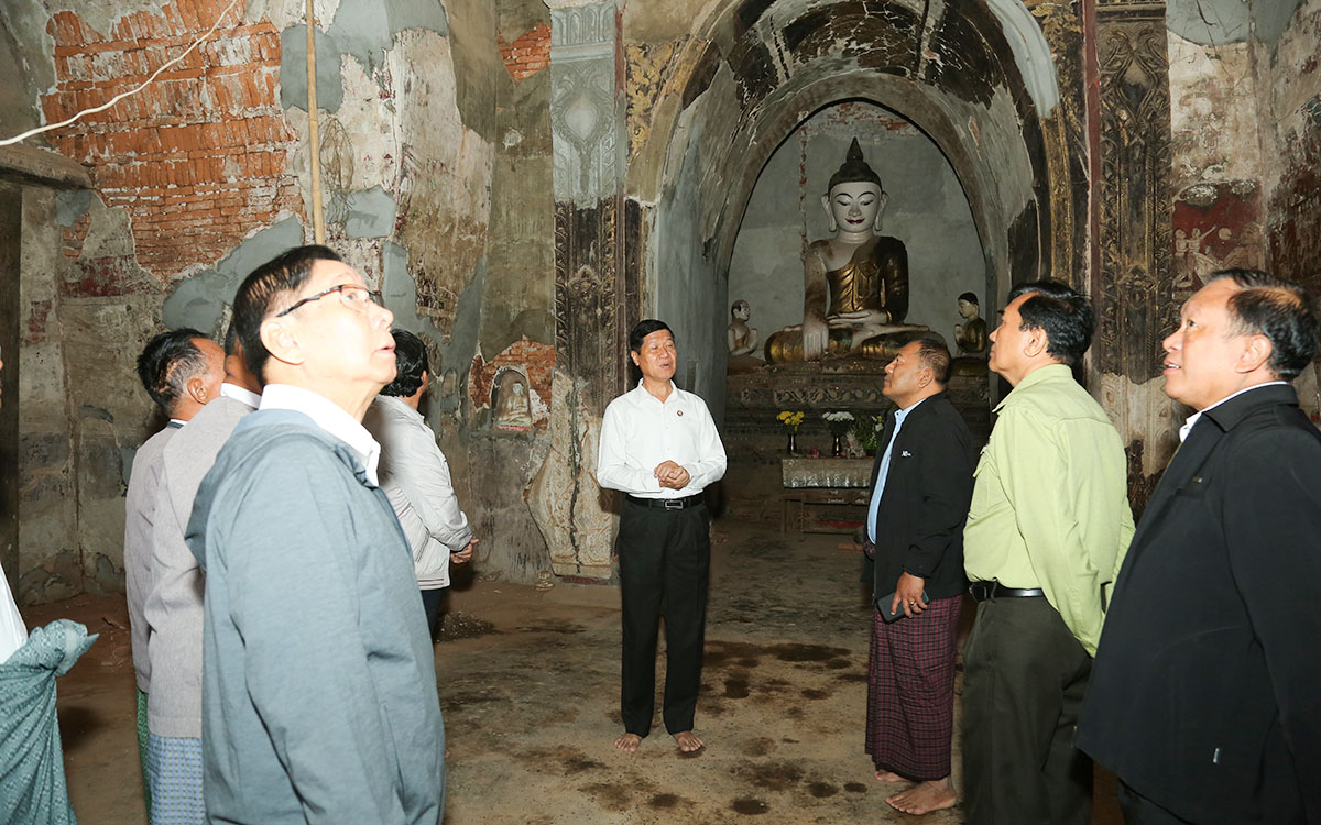 ၎င်းနောက် မန္တလေးငလျင်ကြီးကြောင့် ထိခိုက်ပျက်စီးခဲ့သည့် ရွှေစာရံစေတီတော်ထီးတော်နှင့် သာသနိကအဆောက်အအုံများ၊ ဖိုးကုလားဂူဘုရားတို့အား ပြန်လည်ပြုပြင်မွမ်းမံနေမှုများကို လိုက်လံကြည့်ရှုပြီး တိုင်းဒေသကြီးဝန်ကြီးချုပ်က တာဝန်ရှိသူများအား ထိခိုက်ပျက်စီးခဲ့သည့် ရှေးဟောင်းအဆောက်အအုံများအား ထိန်းသိမ်းရေးလုပ်ငန်းများ ဆောင်ရွက်ရာတွင် ရှေးမူမပျက်ဆောင်ရွက်ရန်၊ ဘုရား၊ စေတီများတွင်ရှိသည့် နံရံဆေးပန်းချီများကို ရှေးမူလက်ရာမပျက် ထိန်းသိမ်းနိုင်ရေးတို့ကို အလေးထားကာ စနစ်တကျကြပ်မတ်ဆောင်ရွက်သွားရေးတို့ကို မှာကြားပြီး ရှင်းလင်းတင်ပြများအပေါ် လိုအပ်သည်များကို ပေါင်းစပ်ညှိနှိုင်းဆောင်ရွက်ပေးခဲ့ကြောင်း သိရသည်။