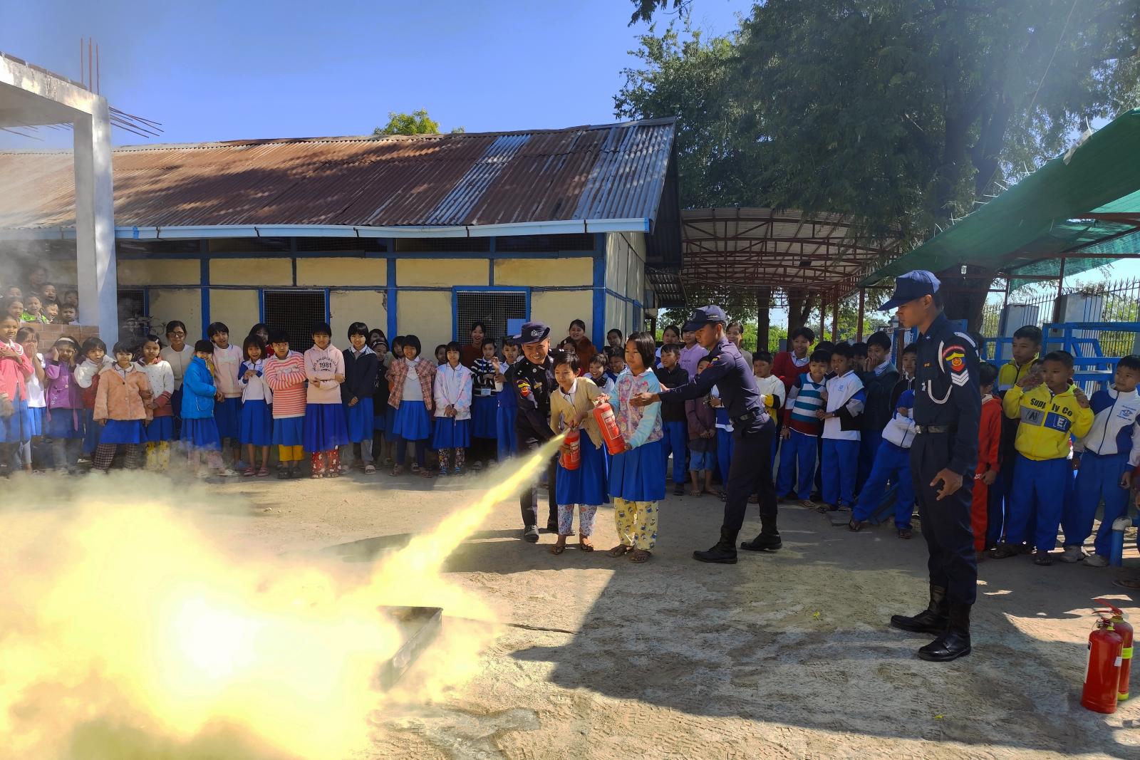 ကွင်းဆင်းဆောင်ရွက်ရာတွင် မြို့နယ်မီးသတ်ဦးစီးမှူးဦးထွန်းထွန်းဝင်းနှင့်တပ်ဖွဲ့ဝင်များက မီးဘေးကြိုတင်ကာကွယ်ရေး ဆောင်ရွက်ထားရှိမှုများကိုစစ်ဆေးပြီး မီးဘေးလုံခြုံရေးအကြံပြုဆွေးနွေးခြင်း၊ ကျောင်းသားကျောင်းသူများနှင့် ဆရာ/ဆရာမများအား မီးလောင်မှု ဖြစ်ပွားစေသည့် အကြောင်းရင်းများကို အသိပညာပေးရှင်းလင်းဆွေးနွေးခြင်းများဆောင်ရွက်ပြီး မီးသတ်ဆေးဘူး စနစ်တကျအသုံးပြု၍ မီးငြှိမ်းသတ်ခြင်း၊ ရေစိုအဝတ်ဖုံးအုပ်ပြီး မီးငြှိမ်းသတ်ခြင်းများကို လက်တွေ့သရုပ်ပြခဲ့ကြောင်း သိရသည်။