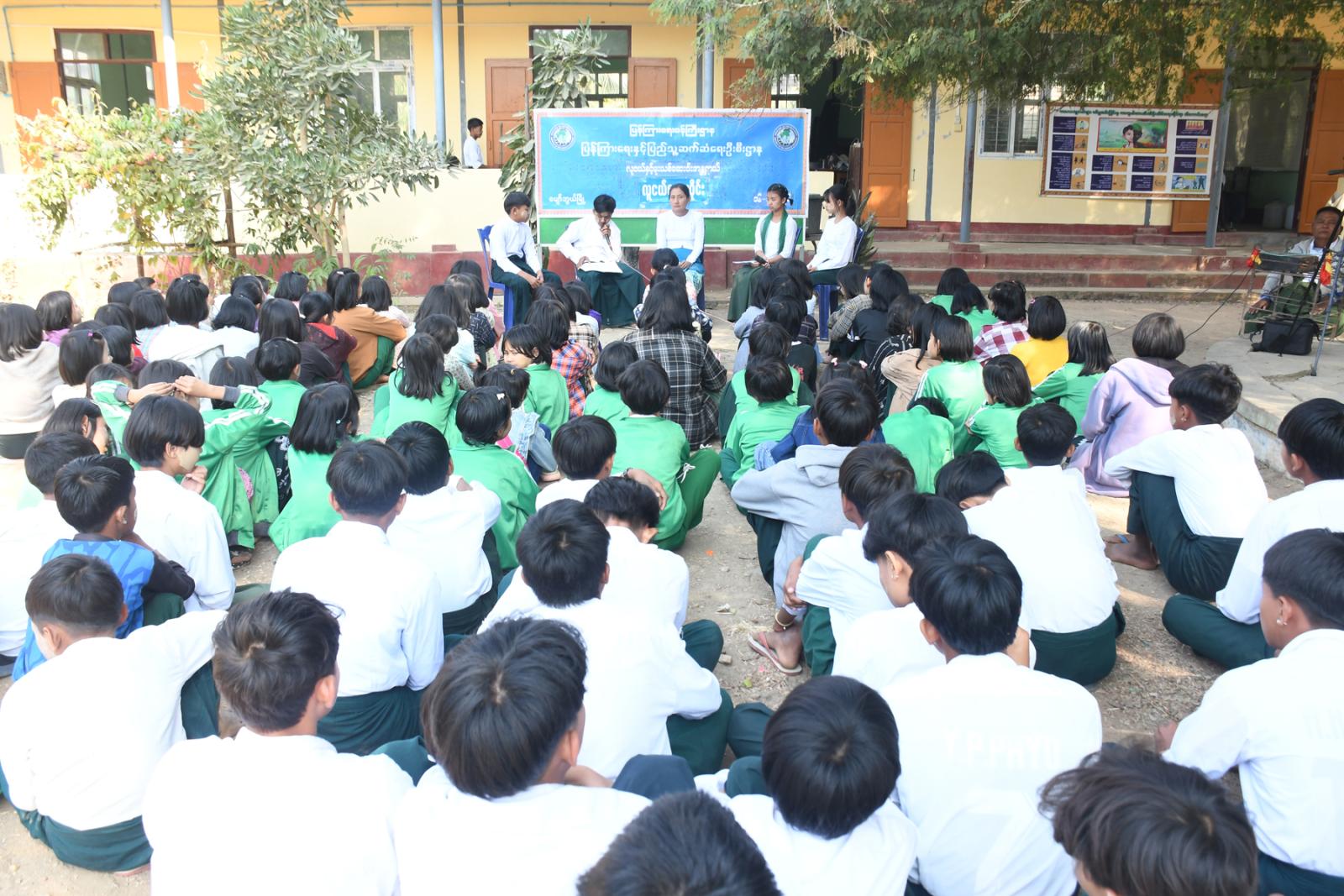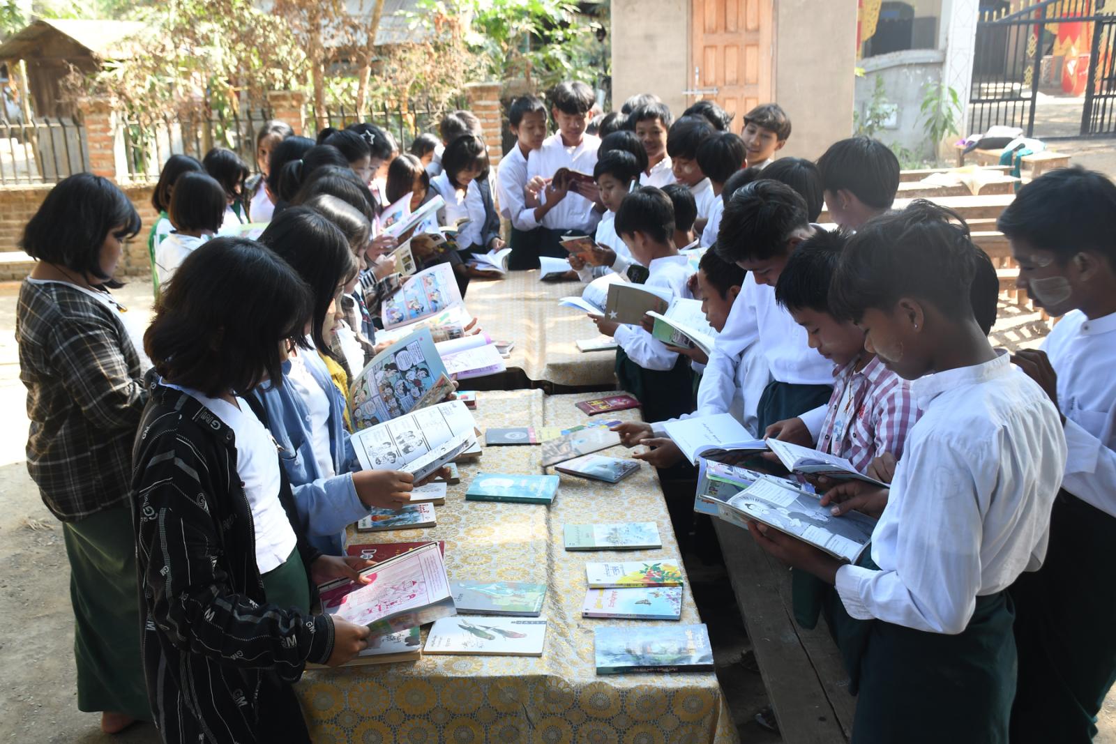 ဆွေးနွေးပြီးနောက် ကျောင်းသား၊ ကျောင်းသူများက နံရံကပ်စာစောင်များ၊ စာဖတ်ရှိန်မြှင့်တင်ရေး အသိပညာပေး စာအုပ်စာစောင်များကို လေ့လာကြည့်ရှုကြသည်။