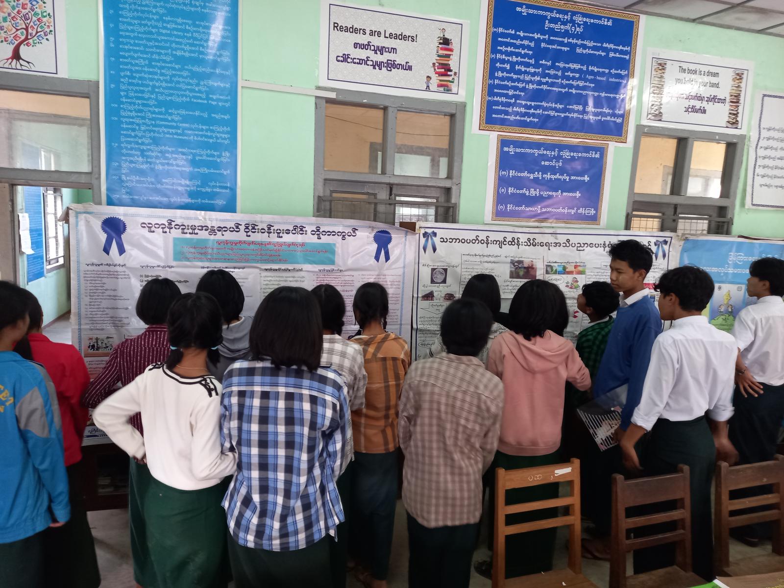 ထို့နောက် ဟောပြောမှုများနှင့်ပတ်သက်၍ ဉာဏ်စမ်းမေးခွန်းများမေးမြန်းရာ ဖြေဆိုနိုင်သူ ၆ ဦးအား သက်ဆိုင်ရာတာဝန်ရှိသူများက အမှတ်တရလက်ဆောင်ပစ္စည်းများပေးအပ်ပြီး မြို့နယ်ရုံးပြည်သူ့စာကြည့်တိုက်မှ ပြသထားရှိသော ကလေးကြိုက်ရုပ်ပြကာတွန်းများ၊ ပုံပြင်စာအုပ်များနှင့် တိုင်းရင်းသားရိုးရာပုံပြင် စာအုပ်များကို လေ့လာဖတ်ရှုပြီး လူကုန်ကူးမှုအန္တရာယ်တားဆီးကာကွယ်ရေး၊ သဘာဝပတ်ဝန်းကျင်ထိန်းသိမ်းရေးနှင့် ကလေးအလုပ်သမားပပျောက်ရေးဆိုင်ရာအသိပညာပေးနံရံကပ်စာစောင်များကို ကျောင်းသား/ သူများက စိတ်ပါဝင်စားစွာ လေ့လာကြည့်ရှုခဲ့ကြကြောင်း သိရသည်။