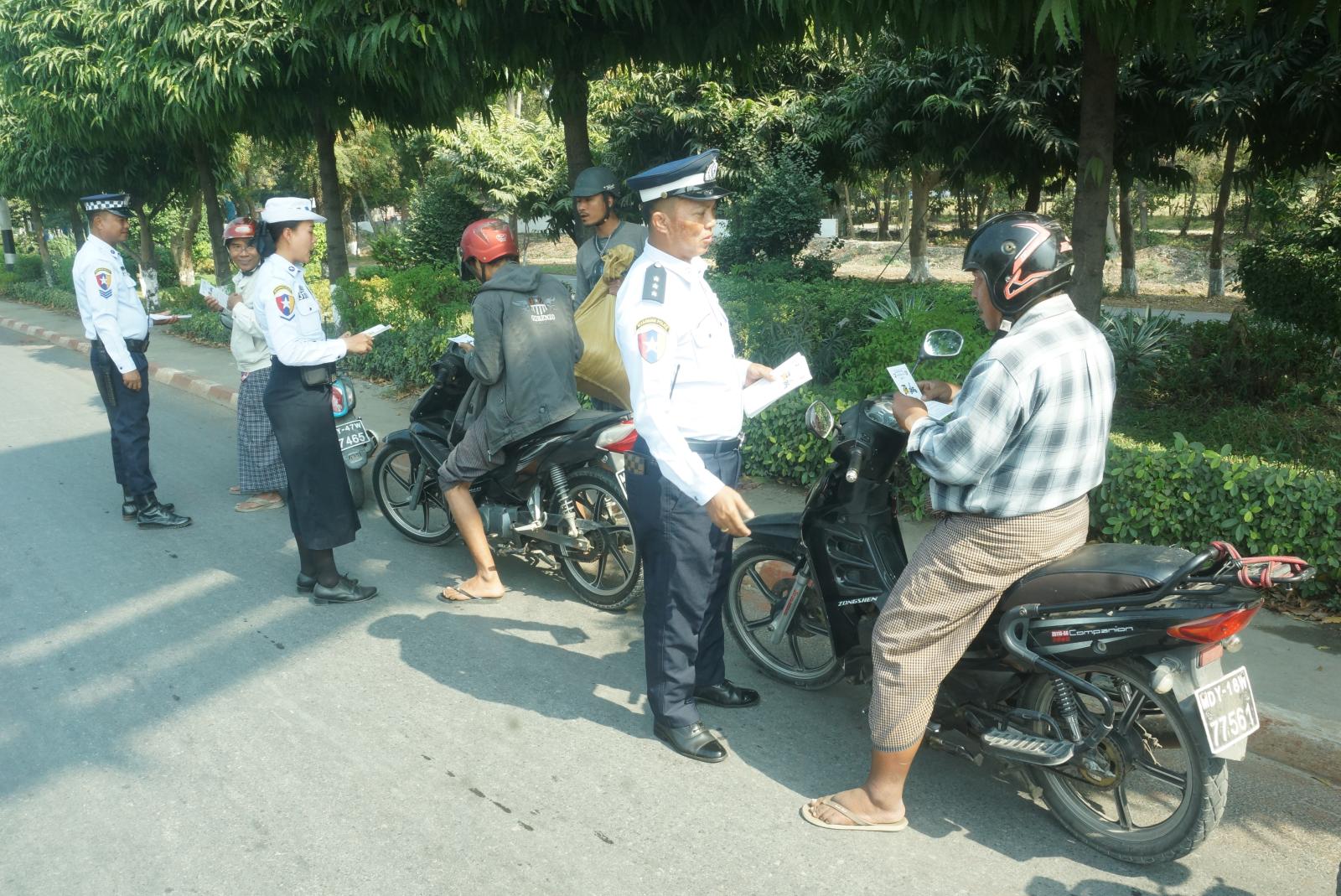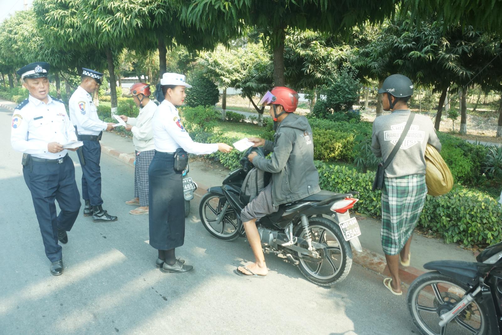 မန္တလေးတိုင်းဒေသကြီး၊ ချမ်းမြသာစည်မြို့နယ်တွင် ပြည်သူများနှင့်မော်တော်ယာဉ်မောင်းများ ယာဉ်စည်းကမ်းလမ်းစည်းကမ်း သိရှိလိုက်နာစေရန်အတွက် "လက်ယာဘက်အစွန်ဆုံး ယာဉ်ကြောကိုကပ်လို့ သုံးဘီးတပ်ယာဉ်နှင့်မော်တော်ဆိုင်ကယ်မောင်းနှင်စို့" လက်ကမ်းစာစောင်ဖြန့်ဝေခြင်းကို ယနေ့နံနက်ပိုင်းက လူစည်ကားရာနေရာများ၌ ဆောင်ရွက်သည်။