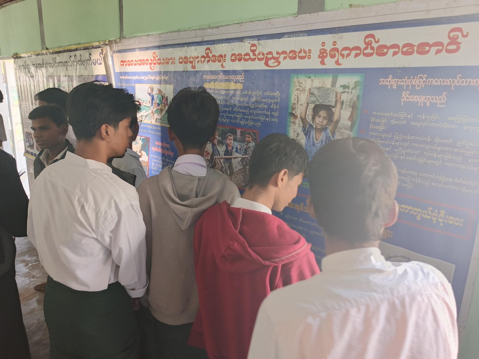 ယင်းနောက် မြို့နယ်ပြန်ကြားရေးနှင့်ပြည်သူ့ဆက်ဆံရေးဦးစီးဌာနမှ ဝန်ထမ်းများက ကလေးအလုပ်သမားပပျောက်ရေးဆိုင်ရာ အသိပညာပေးလက်ကမ်းစာစောင်များကို ဖြန့်ဝေပေးခဲ့ပြီး တက်ရောက်လာသော ကျောင်းသား၊ ကျောင်းသူများက မြို့နယ်ပြန်ကြားရေးနှင့်ပြည်သူ့ဆက်ဆံရေးဦးစီးဌာနမှ ခင်းကျင်းပြသထားသည့် အသိပညာပေးနံရံကပ်ပြဘုတ်များနှင့် သုတ ရသ စာအုပ်များကို စိတ်ပါဝင်စားစွာဖြင့် လေ့လာကြည့်ရှုခဲ့ကြောင်း သိရသည်။