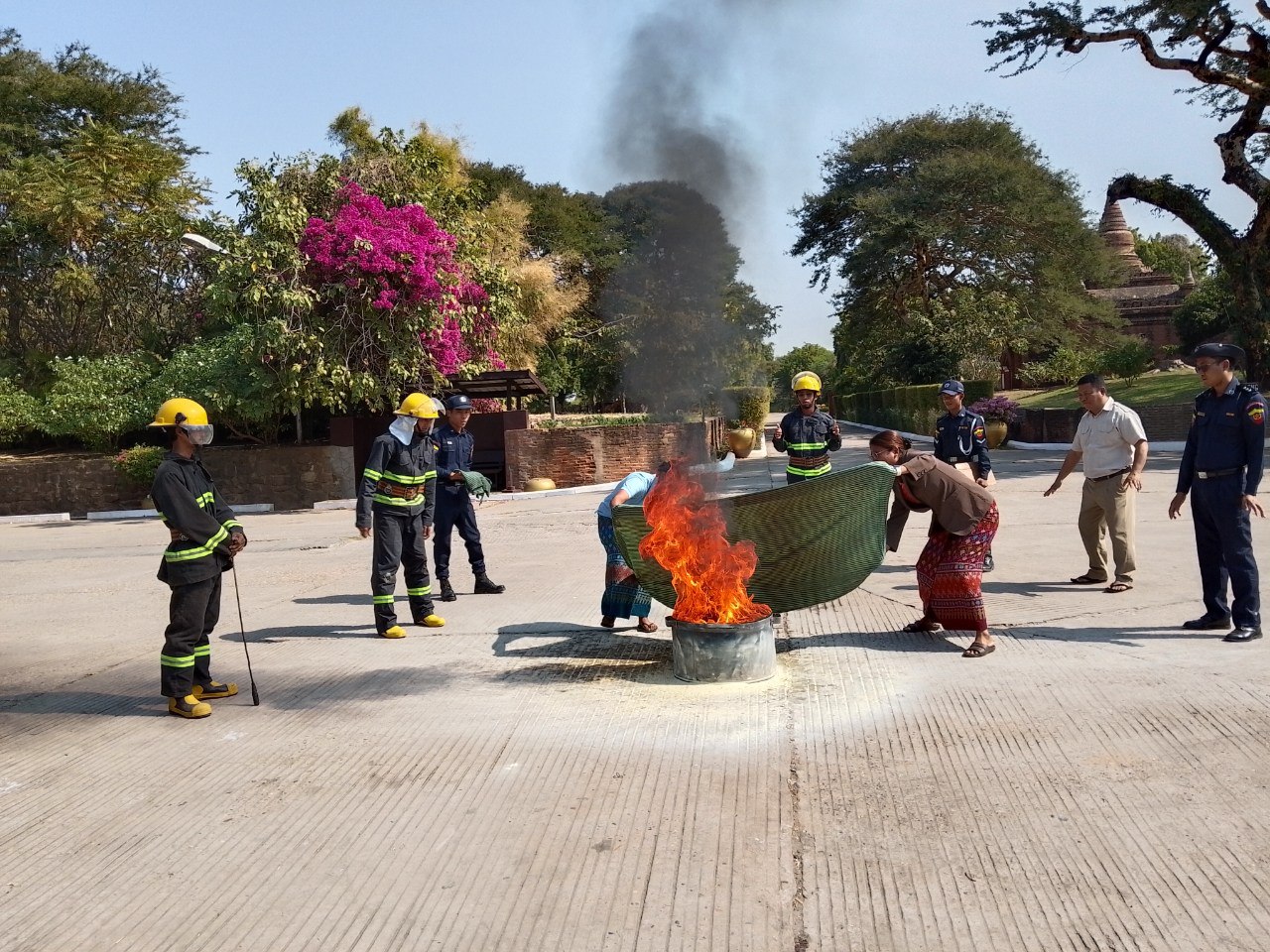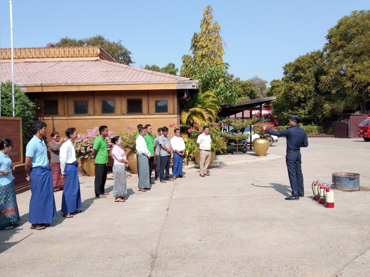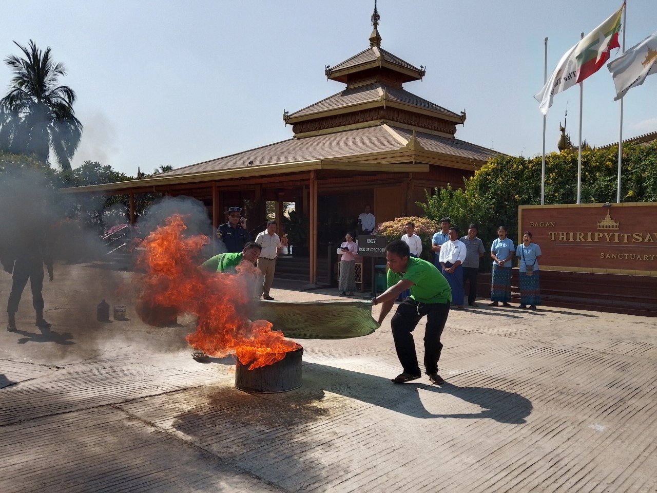 ပွင့်လင်းရာသီရောက်ရှိလာပြီဖြစ်သည်နှင့်အညီ မီးဘေးကြိုတင်ကာကွယ်ရေးလုပ်ငန်း များအား မန္တလေးတိုင်းဒေသကြီးမီးသတ်ဦးစီးဌာန ညွှန်ကြားရေးမှူး ဦးဇော်ဝင်းထွန်း၏ လမ်းညွှန်ချက် နှင့်အညီ အရှိန်အဟုန်မြှင့်တင် ဆောင်ရွက်လျှက်ရှိရာ ဇန်နဝါရီ ၁၇ ရက် နံနက် ၁၀ နာရီခွဲအချိန်က ညောင်ဦးမြို့နယ်၊ ပုဂံမြို့ဟောင်း၊တောင်ဘီကျေးရွာအတွင်းရှိ Thiri Pyitsaya Sakura ဟိုတယ်တွင် ဟိုတယ်ဝန်ထမ်း ၆၀ ဦးခန့်အား ဟိုတယ်တွင် မီးဘေးကြိုတင် ကာကွယ်ရေးကွင်းဆင်းဆောင်ရွက် အသိပညာပေးခြင်းနှင့်လက်တွေ့ ဇာတ်တိုက်လေ့ကျင့်ခြင်း ဆောင်ရွက်ပေးခဲ့ကြောင်းသိရသည်။