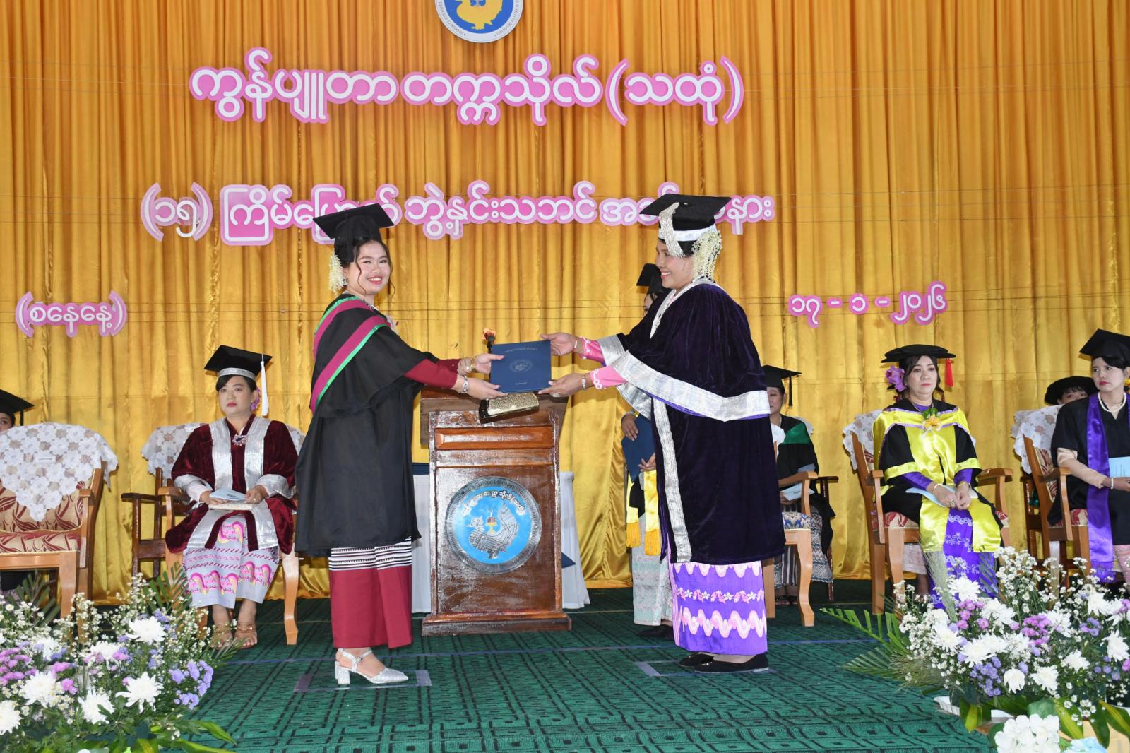 ယင်းနောက် ပါမောက္ခချုပ်က ကွန်ပျူတာသိပ္ပံဘွဲ့ Bachelor of Computer Science (၃၈) ဦး၊ ကွန်ပျူတာနည်းပညာဘွဲ့ Bachelor of Computer Technology (၈) ဦး တို့အား ဘွဲ့လက်မှတ်များ အပ်နှင်းပေးအပ်ပြီး ဘွဲ့ရမှတ်ပုံတင်စာအုပ်တွင် ဘွဲ့ရရှိသူစာရင်းကို အတည်ပြုလက်မှတ်ရေးထိုး၍ ဘွဲ့ရရှိသူများကို ဘွဲ့များနှင့်လျော်ညီသော အဆောင်အယောင် အမှတ်လက္ခဏာဖြစ်သည့် ဝတ်စုံများကို ဝတ်ဆင်ခွင့်ပြုကြောင်း ကြေငြာကာ ဘွဲ့နှင်းသဘင်မိန့်ခွန်း ပြောကြားသည်။