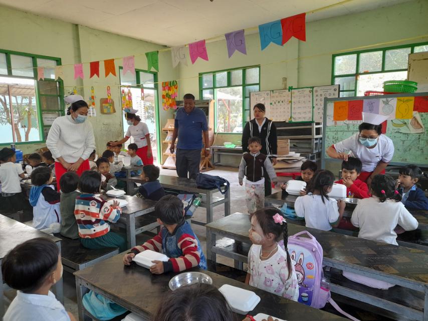 KG ကျောင်းသား/ကျောင်းသူများအား အာဟာရကျွေးမွေးရာတွင် မြို့နယ်ပြည်သူ့ကျန်းမာရေးနှင့် ကုသရေးဦးစီးဌာန မြို့နယ်ဦးစီးမှူး ဒေါက်တာအေးလွင်၊ မြို့နယ်မိခင်ကလေးကျန်းမာရေးဌာနမှ တာဝန်ရှိသူများက သက်ဆိုင်ရာ ကျောင်းအုပ်ဆရာကြီး/ဆရာမကြီးများနှင့် ဆရာ/ဆရာမများ ပူးပေါင်းပြီး KG ကျောင်းသား၊ ကျောင်းသူများအား တစ်ကိုယ်ရေသန့်ရှင်းရေးနှင့် ပတ်သက်သည့် အကြောင်းအရာများအား ရှင်းလင်းပြောကြားခဲ့ပြီး စနစ်တကျ လက်ဆေးနည်းများ၊ သွားခံတွင်း သန့်ရှင်းရေးလုပ်ငန်းများကို လက်တွေ့ဆောင်ရွက်ပေးခဲ့ပြီး ကြက်သားကြော်၊ ချဉ်ပေါင်းဟင်းရည်နှင့် အာဟာရပဲထမင်းများ ကျွေးမွေးခဲ့ကြောင်း မြို့နယ်ပြည်သူ့ကျန်းမာရေးနှင့် ကုသရေးဦးစီးဌာနမှ တာဝန်တစ်ဦးထံမှ သိရသည်။