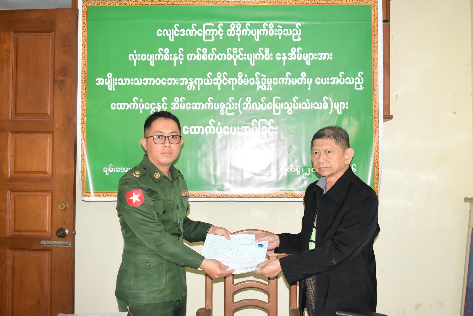 ၂၀၂၅ ခုနှစ်၊ မတ်လ ၂၈ ရက်နေ့တွင် လှုပ်ခတ်ခဲ့သော မန္တလေးငလျင်ကြီးကြောင့် ထိခိုက်ပျက်စီးခဲ့သည့် နေအိမ်များအား အမျိုးသားသဘာဝေဘးအန္တရာယ်ဆိုင်ရာစီမံခန့်ခွဲမှုကော်မတီမှ ပေးအပ်သော ထောက်ပံ့ငွေနှင့် အိမ်ဆောက်ပစ္စည်းများပေးအပ်ခြင်းကို ချမ်းအေးသာစံမြို့နယ် မြို့နယ်စီမံခန့်ခွဲရေးနှင့်အုပ်ချုပ်ရေးကော်မတီရုံး၌ ယနေ့နံနက်ပိုင်းက ဆောင်ရွက်ခဲ့သည်။