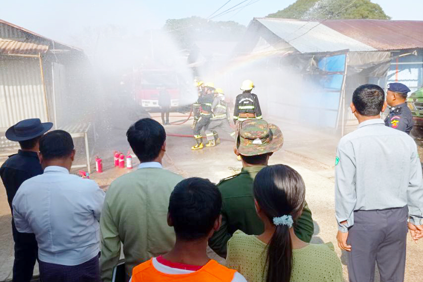 အဆိုပါ အသိပေးသရုပ်ပြပွဲတွင် မြို့နယ်မီးသတ်ဦးစီးမှူးဦးထွန်းထွန်းဝင်းက မီးဘေးအန္တရာယ်ကြိုတင်ကာကွယ်ရေး အသိပညာပေးဟောပြောပြီး မီးသတ်ဆေးဘူးအသုံးပြုပြီး မီးငြှိမ်းသတ်နည်းနှင့် မီးသတ်ယာဉ်များဖြင့်မီးငြှိမ်းသတ်ခြင်းတို့ကို သန္ဓေနှင့် အရန်မီးသတ်တပ်ဖွဲ့ဝင်များ၊ စည်ပင်သာယာရေးဝန်ထမ်းများနှင့် ဈေးသူဈေးသားများက ပူးပေါင်းသရုပ်ပြလေ့ကျင့်ခြင်းများ ပြုလုပ်ခဲ့ကြကြောင်းသိရသည်။