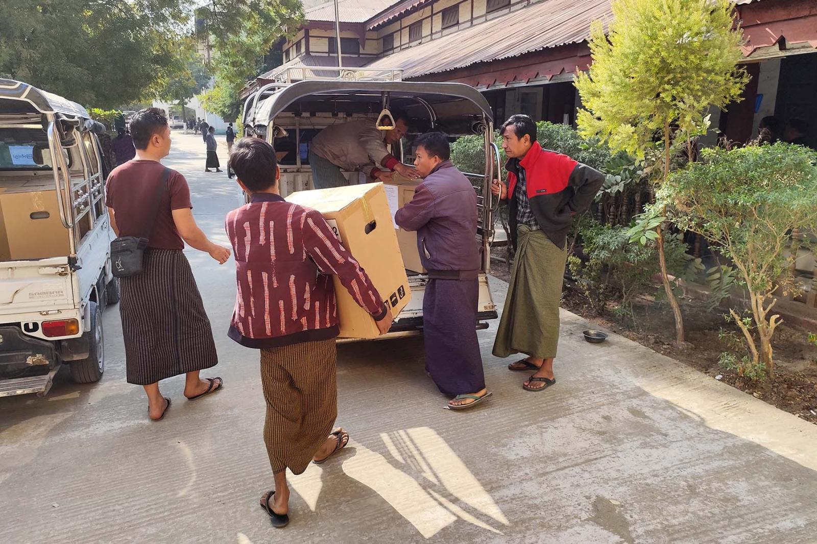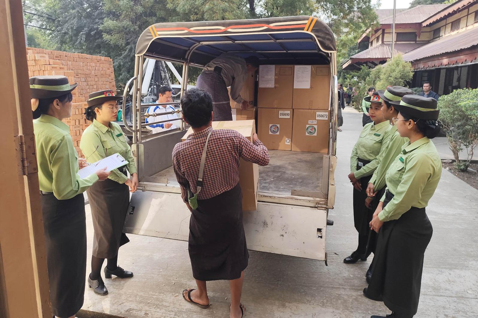 အဆိုပါမြန်မာအီလက်ထရောနစ်မဲပေးစက်နှင့် မဲရုံသုံးပစ္စည်းများ ထုတ်ယူရာတွင် စနစ်တကျဖြစ်စေရေးနှင့် အမှားအယွင်းများမဖြစ်ပေါ်စေရေန်အတွက် မြို့နယ်စီမံခန့်ခွဲရေးနှင့်အုပ်ချုပ်ရေးကော်မတီဥက္ကဋ္ဌ ဦးစိုးထွဋ်နှင့် တာဝန်ရှိသူအဆင့်ဆင့်က အနီးကပ်ကြီးကြပ်၍ သက်ဆိုင် ရာမဲရုံများအား ဇုံနယ်မြေများခွဲ၍ သက်ဆိုင်ရာတာဝန်ရှိသူများထံ ထုတ်ပေးလျက်ရှိသည်။
