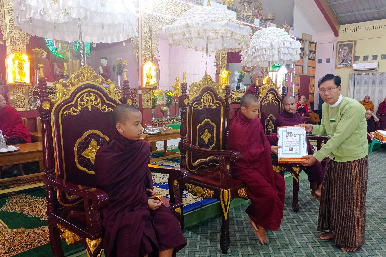 ထို့နောက် ပထမပြန်စာမေးပွဲအောင် ၄ ပါးနှင့် ပရိယတ္တိအခြေခံစာမေးပွဲ စာအောင်သာမဏေ ၉၈ ပါးတို့အား မြို့နယ်စီမံခန့်ခွဲရေးနှင့်အုပ်ချုပ်ရေးကော်မတီဥက္ကဋ္ဌဦးမျိုးသက်ကျော်နှင့် ကော်မတီဝင်များ၊ မြို့နယ်အဆင့်ဌာနဆိုင်ရာများ၊ ရပ်ကွက်အုပ်ချုပ်ရေးမှူးများနှင့် ရပ်ကွက်ဆွမ်းလောင်းအသင်းများက စာအောင်လက်မှတ်များ၊ လှူဖွယ်ပစ္စည်းများနှင့် ဝတ္ထုငွေများ ဆပ်ကပ်လှူဒါန်းကြသည်။