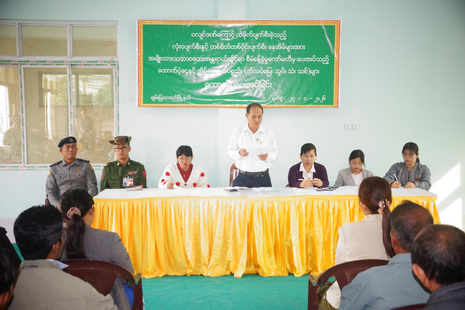 ဦးစွာ ခရိုင်အမျိုးသားသဘာဝဘေးအန္တရာယ်ဆိုင်ရာစီမံခန့်ခွဲမှုကော်မတီမှ လက်ထောက်ညွှန်ကြားရေးမှူး ဦးဝင်းသူက အမှာစကားပြောကြားပြီး ဒုတိယမြို့နယ် အုပ်ချုပ်ရေးမှူး ဦးမြင့်ဇော်က နိုင်ငံတော်အနေဖြင့် ငလျင်ဘေးအန္တရာယ်ခံစားရသည့်ပြည်သူများအား ထောက်ပံ့ပေးနိုင်ခဲ့မှုအခြေအနေများ၊ ယနေ့တွင်လည်း နေအိမ်တစ်စိတ်တစ်ပိုင်းပျက်စီးမှု၊ အလုံးစုံပျက်စီးမှုတို့အတွက် နိုင်ငံတော်မှသတ်မှတ်ထားသည့် နှုန်းထားအတိုင်း ငွေသားပေးအပ်မည့် အခြေအနေများကို ရှင်းလင်းဆွေးနွေးသည်။