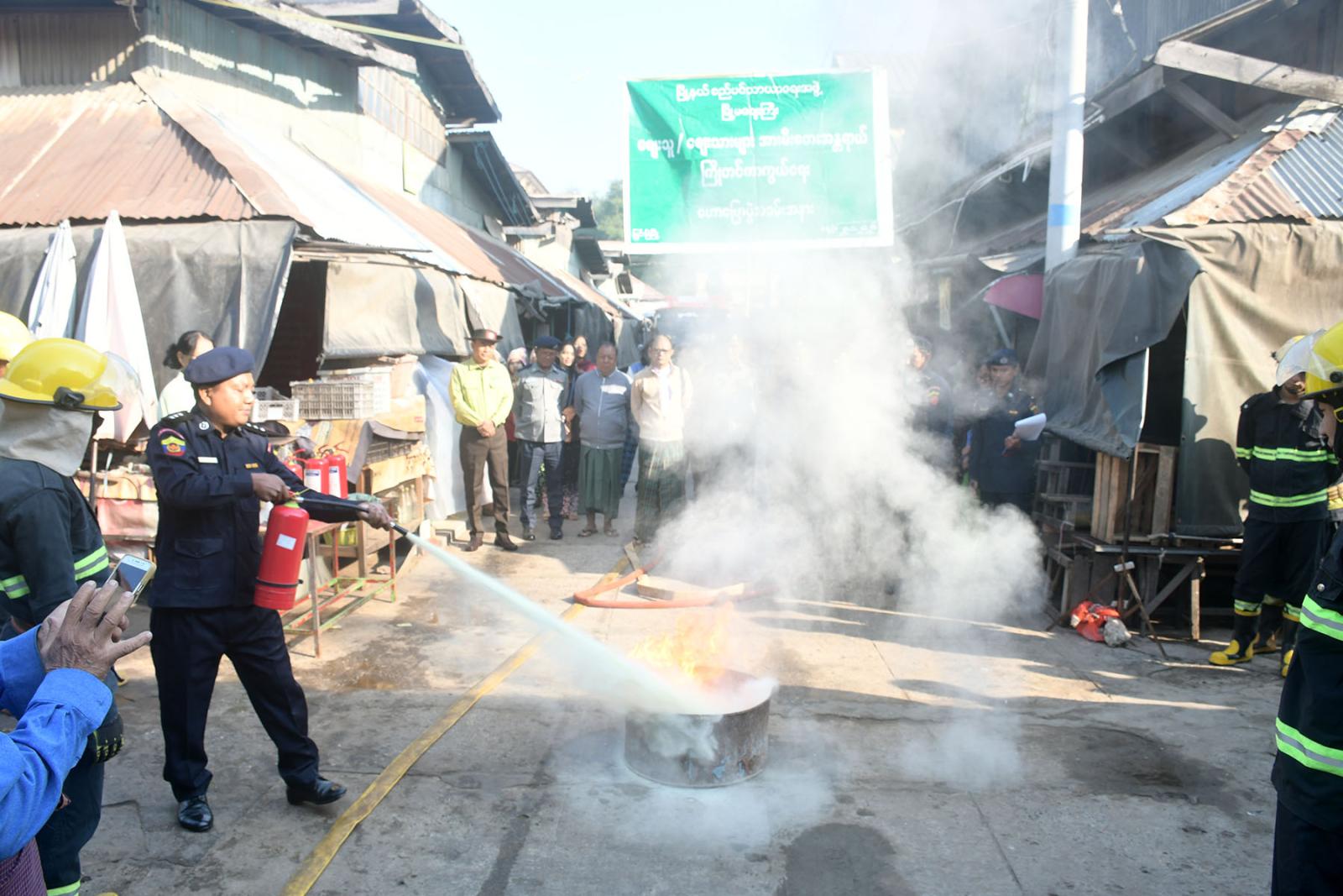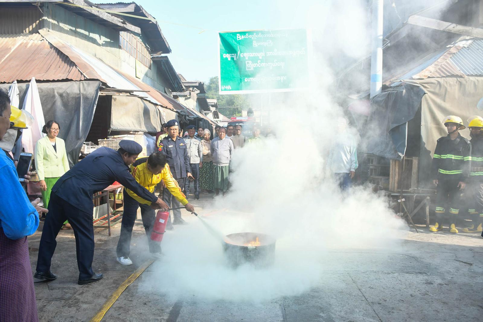 အဆိုပါ မီးဘေးအန္တရာယ်ကြိုတင်ကာကွယ်ရေး လက်တွေ့သရုပ်ပြသခြင်းနှင့် အသိပညာပေးဟောပြောခြင်းကို မြို့နယ်မီးသတ်ဦးစီးမှူး ဦးအောင်ကိုသန့်က ခရိုင်မီးသတ်ဦးစီးဌာနရဲ့ လမ်းညွှန်ချက်များနှင့်အညီ စည်ပင်သာယာဈေးအတွင်းရှိ ဈေးဆိုင်ခန်းများ မီးဘေးအန္တရာယ် ကြိုတင် ကာကွယ်ရေးအတွက် ဆောင်ရန်/ဆောင်ရန်များ စာတွေ့/လက်တွေ့ပါ ရှင်းလင်းပြောကြားခဲ့ပြီး မီးသတ်ဆေးဘူးဖြင့် မီးငြိမ်းသတ်နည်းကို ရှင်းလင်းပြသပေးပြီး တက်ရောက်လာသော ဈေးသူ၊ ဈေးသားများအား လက်တွေ့သရုပ်ပြ ငြိမ်းသတ်စေခဲ့သည်