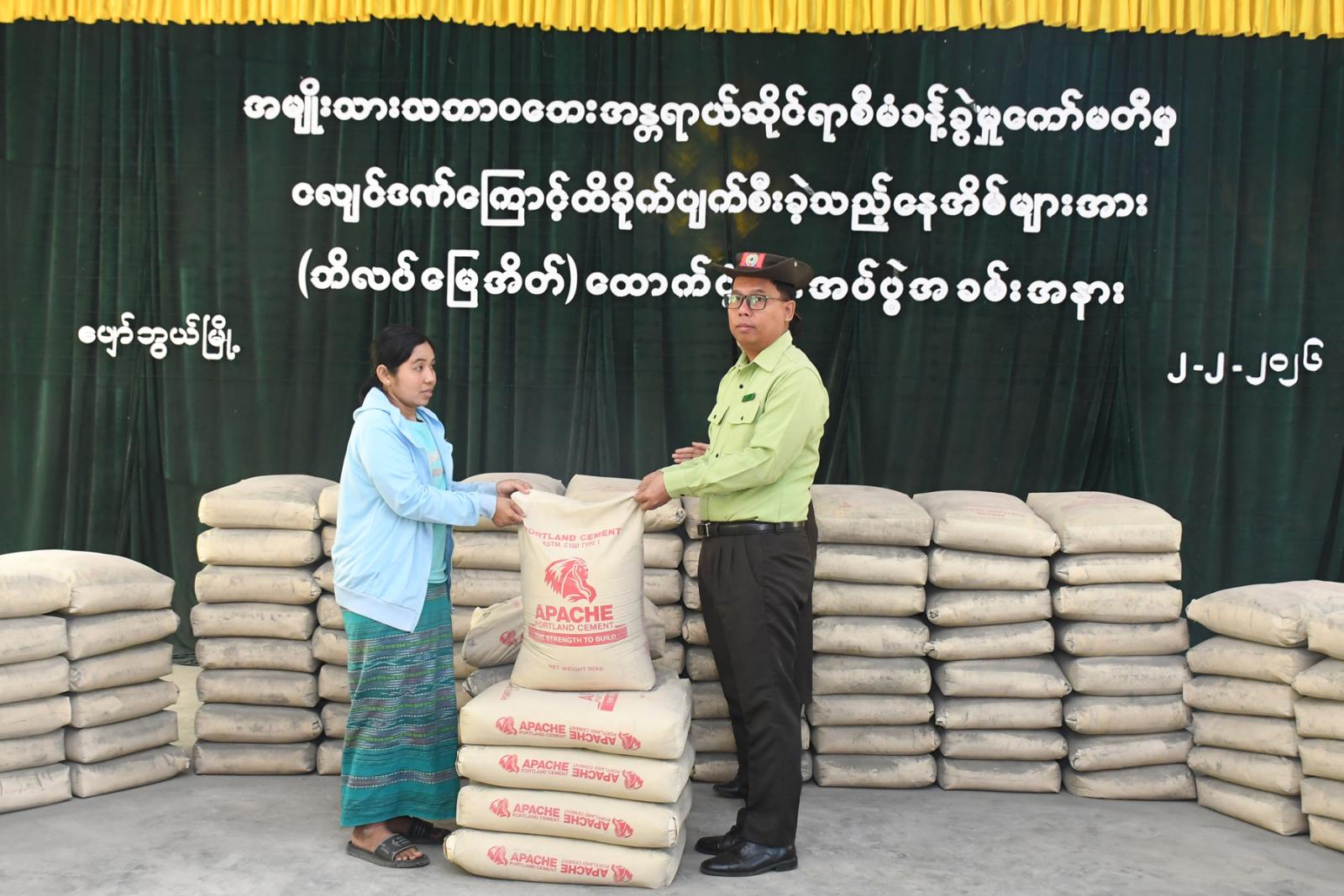 အမျိုးသားသဘာဝဘေးအန္တရာယ်ဆိုင်ရာစီမံခန့်ခွဲမှုကော်မတီမှ မြို့ပေါ်ရပ်ကွက် ၇ ရပ်ကွက်နှင့် ကျေးရွာအုပ်စု ၅ အုပ်စုမှ နေအိမ်အလုံးစုံပျက်စီးမှု ၁၅၆ လုံးအတွက် ဘိလပ်မြေအိတ် ၄၂၀၀၀ ကျော်ကိုပေးအပ်ခဲ့ရာ ခရိုင်စီမံခန့်ခွဲရေးနှင့်အုပ်ချုပ်ရေးကော်မတီဥက္ကဋ္ဌ ဦးစိန်မြင့်နှင့်တာဝန်ရှိသူများက ပြည်သူများထံ ထပ်ဆင့်ပေးအပ်ခဲ့ကြောင်းသိရသည်။
