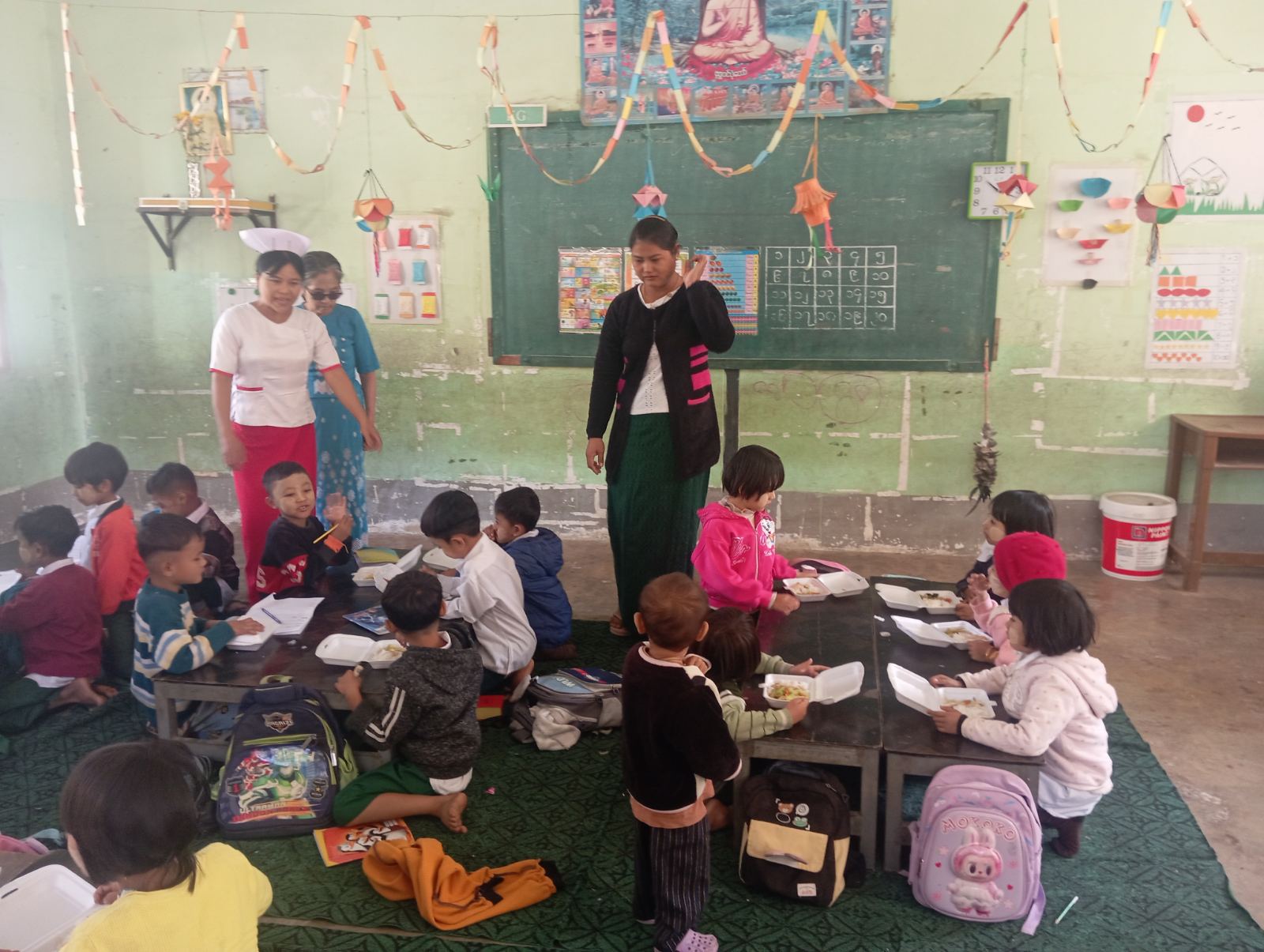 ရှေးဦးစွာ မြို့နယ်မိခင်နှင့်ကလေးစောင့်ရှောက်ရေးဆေးခန်းမှ သွားဖွားဆရာမ ကျောင်းကျန်းမာရေး ဆရာမဒေါ်ဇာဇာဝင်းက ကျောင်းသား၊ ကျောင်းသူလေးများအား တစ်ကိုယ်ရေသန့်ရှင်းရေးအကြောင်းများ ရှင်းလင်းဟောပြောခဲ့ပြီး စနစ်တကျလက်ဆေးနည်းများကို လက်တွေ့လုပ်ဆောင်စေခဲ့ ပြီး ကျောင်းအုပ်ဆရာမကြီး ဒေါ်နှင်းနှင်းခိုင်နှင့်ဆရာ/ဆရာမများနှင့်အတူ ကြက်ဥ၊ ရွှေဖရုံ၊ ပဲဝါလေးဟင်းများနှင့် အာဟာရထမင်းများ၊ ငှက်ပျောသီးများ ကျွေးမွေးခဲ့ကြောင်း သိရသည်။