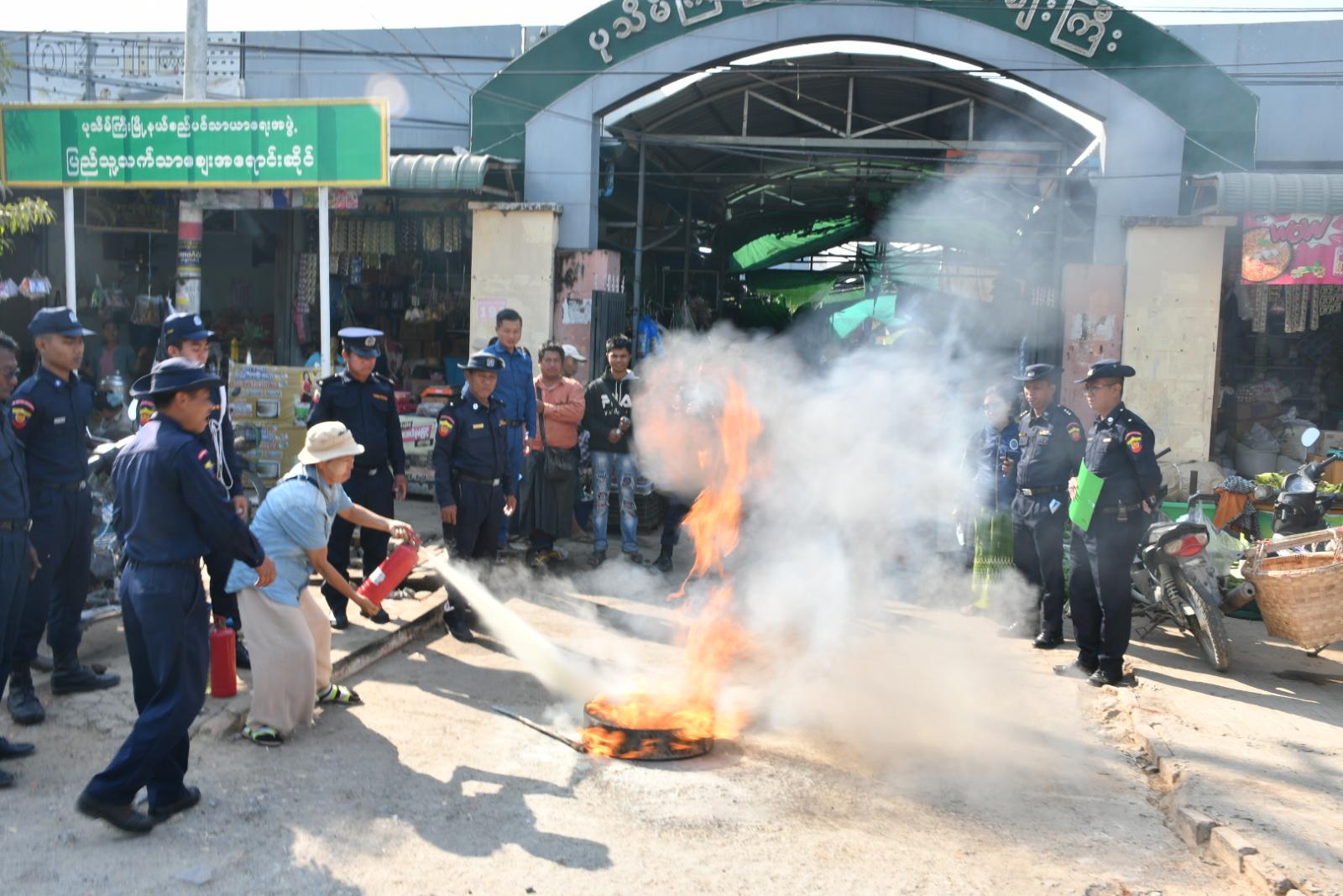 ထို့နောက် ဆီမီး၊ ဂတ်(စ်)မီး လက်တွေ့မီးငြှိမ်းသတ်ပုံများအား တာဝန်ရှိသူတစ်ဦးက ရှင်းလင်းပြောကြားပြီးနောက် ဈေးသူဈေးသားများ၊ ဈေးဝယ်လာသူများဖြင့် လက်တွေ့မီးငြှိမ်းသတ်ခြင်းများ ဆောင်ရွက်ကြသည်။ ဆက်လက်၍ မြို့မဈေးကြီးအတွင်း လှည့်လည်ကာ တစ်ဆိုင်ဝင်တစ်ဆိုင်ထွက် မီးဘေးအန္တရာယ်ကင်းဝေးစေရေး ကြည့်ရှုစစ်ဆေးကာ အသိပညာပေး လက်ကမ်းစာစောင်များ ဖြန့်ဝေပေးခဲ့ကြသည်။
