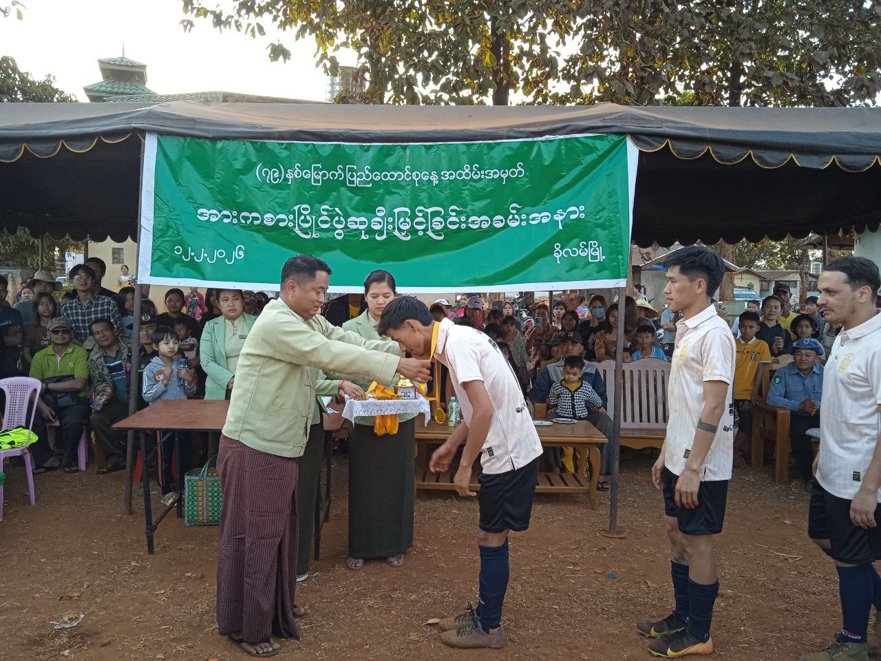 ယင်းနောက် ဆုချီးမြှင့်ပွဲအခမ်းအနားအား ဆက်လက်ကျင်းပရာ ပွဲစဉ်တစ်လျှောက်အကောင်းဆုံး ဂိုးသမားဆုကို အမှတ် (၁) ရပ်ကွက်အသင်းမှ ကျောနံပါတ် (၁)နှင့် နောက်တန်းအကောင်းဆုံးဆုကို အမှတ် (၃) ရပ်ကွက်အသင်းမှ ကျောနံပါတ် (၃၀) တို့အား လူဝင်မှုကြီးကြပ်ရေးနှင့်ပြည်သူအင်အားဦးစီး ဌာနမှလည်းကောင်း၊ ပွဲစဉ်တစ်လျှောက် အလယ်တန်းအကောင်းဆုံးဆုကို အမှတ် (၅၊ ၆) ရပ်ကွက်အသင်းမှ ကျောနံပါတ် (၁၁) အား ကုတင် (၁၀၀) ပြည်သူ့ဆေးရုံးမှလည်းကောင်း၊ ပွဲစဉ်တစ်လျှောက် ရှေ့တန်းအကောင်းဆုံးဆုကို အမှတ် (၅၊ ၆) ရပ်ကွက်အသင်းမှ ကျောနံပါတ်(၁၀)အား မီးသတ်ဦးစီးဌာနမှလည်းကောင်း၊ ပွဲစဉ်တစ်လျှောက်အကောင်းဆုံး အားကစားသမားဆုကို အမှတ် (၁) ရပ်ကွက်အသင်းမှ ကျောနံပါတ် (၈) အား သစ်တောဦးစီးဌာနမှလည်းကောင်း၊ တတိယဆုရရှိသော အမှတ် (၃) အသင်းအား စည်ပင်သာယာရေးဦးစီးဌာန၊ မြို့ဦးစီးမှူးမှလည်းကောင်း၊ ဒုတိယဆုရရှိသည့် အမှတ်(၅၊၆)ရပ်ကွက် အသင်းအား မြန်မာနိုင်ငံရဲတပ်ဖွဲ့၊ စခန်းမှူးမှလည်းကောင်း၊ ပထမဆုရရှိသည့် အမှတ် (၁)ရပ်ကွက် အသင်းအား မြို့စီမံခန့်ခွဲရေးနှင့်အုပ်ချုပ်မှုကော်မတီ ဥက္ကဋ္ဌ ဦးအောင်းမင်းစိုးတို့က လည်ဆွဲဆုတံဆိပ်၊ ငွေသားဆုနှင့် ဆုကလပ်များ အသီးသီးပေးအပ်ချီးမြှင့်ခဲ့ကြောင်း သိရှိရသည်။