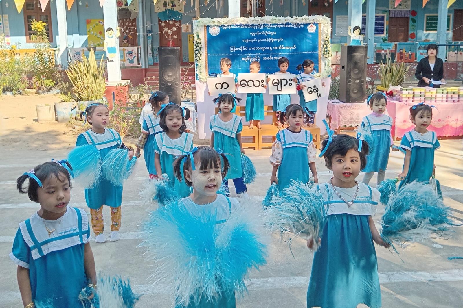 ရှေးဦးစွာ ရေနံချောင်းမူလတန်းကြိုကျောင်းအုပ်ဆရာမကြီး ဒေါ်ပပအုန်းနှင် ဆရာမများက ဦးဆောင်ကာ သားငယ်သမီးငယ်လေးများက တေးသီးချင်းများဖြင့် ကပြဖျော်ဖြေပြီး ကလေးများနေ့ကဗျာ၊ ဗိုလ်ချုပ်အောင်ဆန်းနှင့်ပတ်သက်သည့် ကဗျာများ၊ (၃၈) ဖြာမင်္ဂလာတရားကဗျာများကို ရွတ်ဆိုခဲ့ကြသည်။ ထို့နောက် သားငယ်သမီးငယ်လေးများက မိုးပျံပူဖောင်းများ လွှတ်တင်ကာ နိဗ္ဗာန်ဈေးပွဲတော်ကို ဖွင့်လှစ်ပြီး မိဘအုပ်ထိန်းသူများအဖွဲ့ (၁၁) က သားငယ်သမီးငယ် ၁၁၅ ဦးအား ထမင်းဘူး၊ လက်ဆွဲခြင်း၊ ရောင်စုံခဲ့တံ၊ ရောင်ခြယ်စာအုပ်၊ ဦးထုပ်၊ ရေပြွတ်၊ ရေခွက်စသည့် လက်ဆောင်ပစ္စည်းများ ပေးဝေခဲ့ကြောင်း သိရသည်။