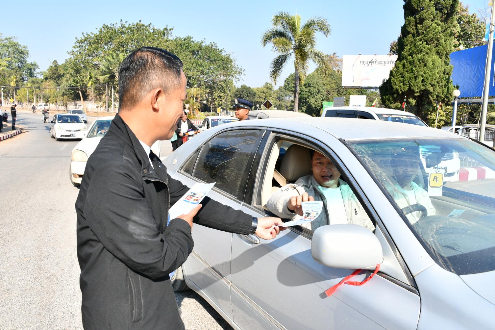 ထိုသို့ဆောင်ရွက်ရာတွင် မြို့နယ်မီးဘေးလုံခြုံရေးအဖွဲ့ဥက္ကဋ္ဌ ဦးဇော်နိုင်ဦး၊ ခရိုင်ပြန်ကြားရေးနှင့်ပြည်သူ့ဆက်ဆံရေးဦးစီးဌာမှ လက်ထောက်ညွှန်ကြားရေးမှူး ဦးစိုင်းထွန်းနေလှိုင်၊ ခရိုင်မီးသတ်ဦးစီးမှူးရုံးမှ လက်ထောက်ညွှန်ကြားရေးမှူး ဦးစိုးမင်းခိုင်၊ ခရိုင်ပတ်ဝန်းကျင်ထိန်းသိမ်းရေးဦးစီးဌာနနှင့် မြို့နယ်မီးသတ်ဦးစီးဌာနမှ တာဝန်ရှိသူများက မီးဘေးအန္တရာယ်ကြောင့် ထိခိုက်ပျက်စီးဆုံးရှုံးမှာ လျော့နည်းစေရန်အတွက် မီးဘေးလုံခြုံရေး အသိပညာပေး လက်ကမ်း စာစောင်များအား မြို့တော်ခန်းမရှေ့လမ်းမကြီး၌ သွားလာလျက်ရှိသော ပြည်သူများ လက်ဝယ်သို့ အခမဲ့ဖြန့်ဝေပေးခဲ့ကြောင်း သိရသည်။