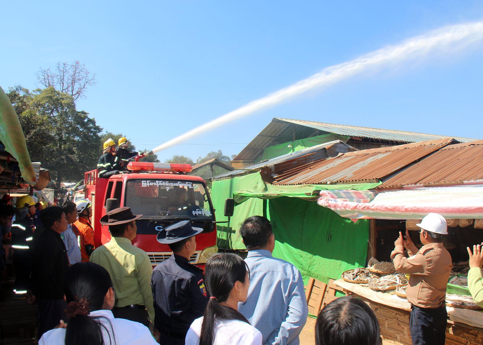ဆက်လက်၍ မီးငြှိမ်းသတ်မှု ဇာတ်တိုက်လေ့ကျင့်ခဲ့ရာ မြို့နယ်မီးသတ်ဦးစီးဌာန၊ မြို့နယ်စည်ပင်သာယာရေးဌာန၊ ဈေးကော်မတီ၊ မြို့နယ်ရဲတပ်ဖွဲ့၊ ယာဉ်ထိန်းရဲတပ်ဖွဲ့၊ ကြက်ခြေနီတပ်ဖွဲ့နှင့် လူမှုရေးအသင်းအဖွဲ့များပူးပေါင်း၍ ဈေးအတွင်းရှိ ရေကန်များမှတဆင့်အပေါ့စား မီးစက်ဖြင့် မီးငြှိမ်းသတ်မှုသရုပ်ပြခြင်း၊ မီးသတ်ကားဖြင့်မီးငြိမ်းသတ်မှု သရုပ်ပြခြင်း၊ ထိခိုက်ဒဏ်ရာရရှိသောလူနာများကို ရှာဖွေကယ်ဆယ်မှုသရုပ်ပြခြင်းတို့ကို ဆောင်ရွက်ခဲ့ကြသည်။