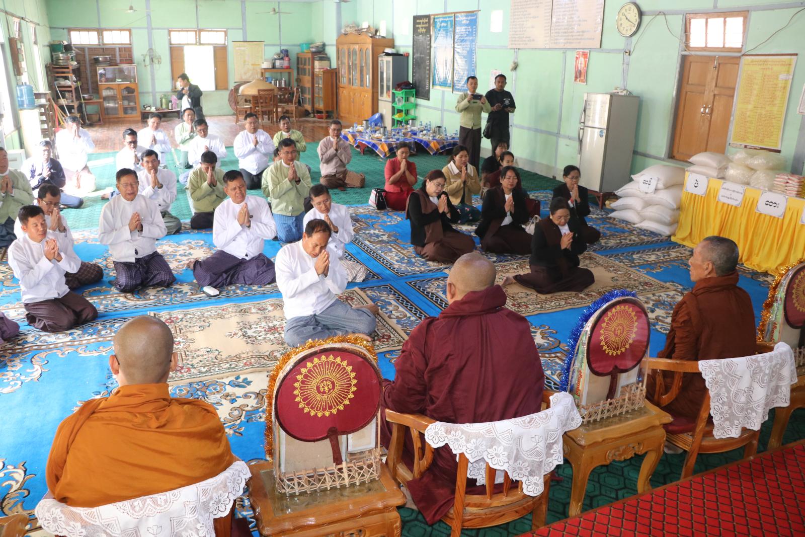 ဆက်လက်၍ တိုင်းဒေသကြီးဝန်ကြီးချုပ်နှင့်တာဝန်ရှိသူများသည် မုံရွာမြို့ပေါ်ရှိ ဘုန်းတော်ကြီး ကျောင်းတိုက်များတွင် သတင်းသုံးတော်မူကြသည့် ဆရာတော်/သံဃာတော်များ ဆွမ်းကွမ်း အခက်အခဲမရှိစေရေးအတွက် တိုင်းဒေသကြီးအစိုးရအဖွဲ့မှ ဆွမ်းဆန် ဆီ၊ ဆား၊ ပဲ အမယ်(၄)မျိုး ဆက်ကပ်လှူဒါန်းခြင်းကို မုံရွာမြို့၊ လယ်တီရပ်ကွက်ရှိ မဟာလယ်တီကျောင်းတိုက်ကြီးတွင် ကျင်းပပြုလုပ်ရာ ပင့်သံဃာဆရာတော်ကြီးများထံ တိုင်းဒေသကြီးဝန်ကြီးချုပ်နှင့်ဇနီး၊ တိုင်းဒေသကြီးတရားသူကြီးချုပ်နှင့်ဇနီး၊ တိုင်းဒေသကြီး အစိုးရအဖွဲ့ဝင်များနှင့်ဇနီးများမှ ဆွမ်းဆန်၊ ဆီ၊ ဆား၊ ပဲ အမယ်(၄)မျိုးတို့အား ဆက်ကပ်လှူဒါန်းကြပြီး တိုင်းဒေသကြီး ဝန်ကြီးချုပ်က သာသနာရေးဆိုင်ရာများ လျှောက်ထားခဲ့သည်။