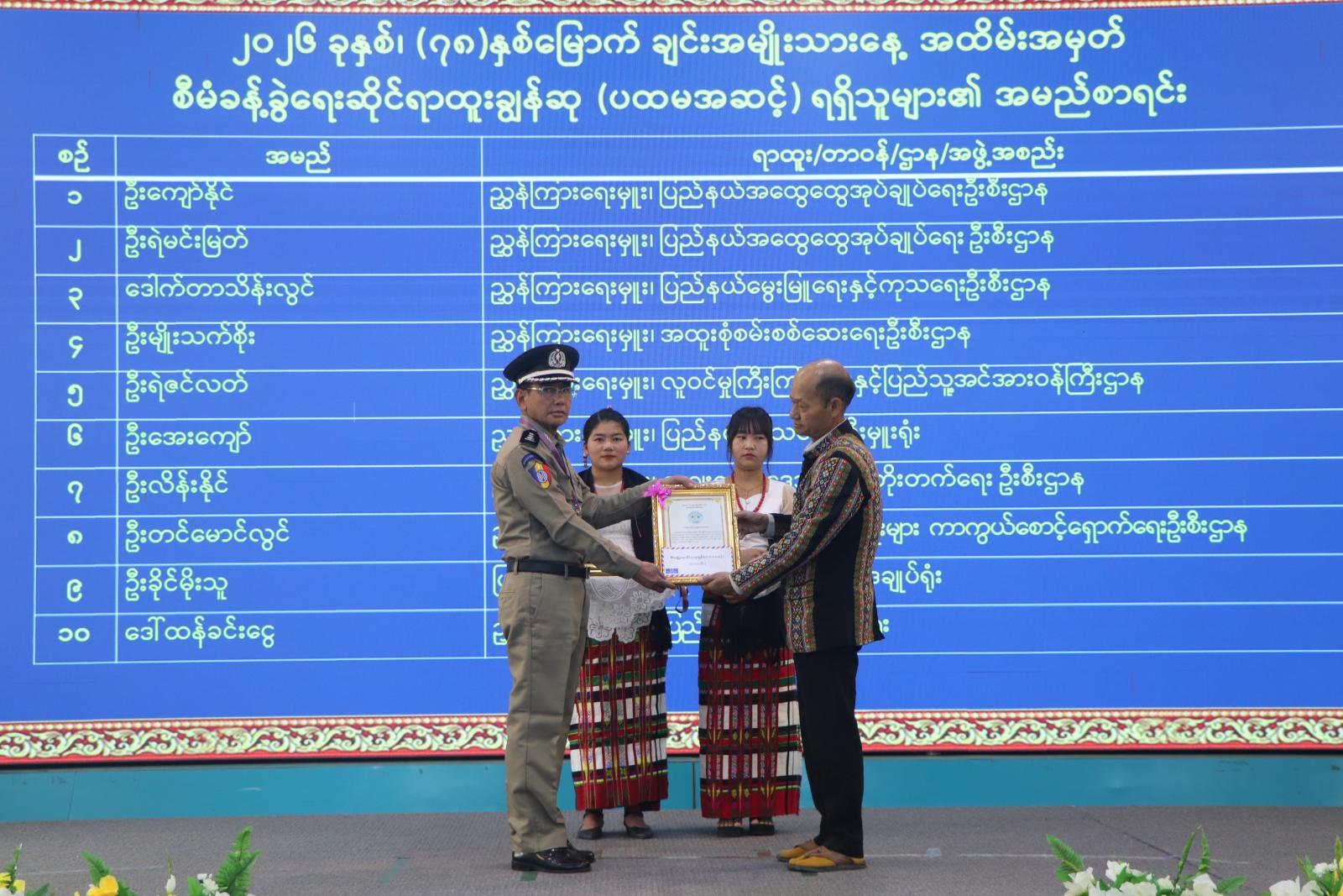 ဆက်လက်၍ (၇၈)နှစ်မြောက် ချင်းအမျိုးသားနေ့အထိမ်းအမှတ် ပြိုင်ပွဲများတွင် ဆုရရှိသူများ အား ဆုချီးမြှင့်ခြင်းအခမ်းအနား ကျင်းပရာ အဆင့်မြင့်ပညာအဆင့်နှင့် အခြေခံပညာအထက်တန်း အဆင့် စာစီစာကုံးပြိုင်ပွဲများတွင် ဆုရရှိသူများ၊ အလွတ်တန်းပိုက်ကျော်ခြင်းပြိုင်ပွဲနှင့် ရောင်စုံအလှ ဓာတ်ပုံပြိုင်ပွဲများတွင် ဆုရရှိသူများကို ပြည်နယ်ဝန်ကြီးချုပ်ကလည်းကောင်း၊ အဆင့်မြင့်ပညာ အဆင့်နှင့် အခြေခံပညာအထက်တန်းအဆင့် ကဗျာပြိုင်ပွဲတွင် ဆုရရှိသူများနှင့် အလွတ်တန်းစစ်တု ရင်ပြိုင်ပွဲများတွင် ဆုရရှိသူများအား ပြည်နယ်ဝန်ကြီးချုပ်၏ဇနီး ဒေါ်ဒိမ်ခန့်လွင်ကလည်းကောင်း ၊ အဆင့်မြင့်ပညာအဆင့်နှင့် အခြေခံပညာအထက်တန်းအဆင့် ပန်းချီပြိုင်ပွဲတွင် ဆုရရှိသူများနှင့် အလွတ်တန်း စားပွဲတင်တင်းနစ်ပြိုင်ပွဲတွင် ဆုရရှိသူများကို ပြည်နယ်တရားလွှတ်တော်တရားသူကြီး ချုပ်ကလည်းကောင်း ၊ အဆင့်မြင့်ပညာအဆင့်နှင့် အခြေခံပညာအထက်တန်းအဆင့် ကာတွန်းပြိုင်ပွဲ တွင် ဆုရရှိသူများနှင့် အခြေခံပညာအထက်တန်းအဆင့် ဘော်လီဘော ( ကျား ) ပြိုင်ပွဲတွင် ဆုရရှိသူ များကို ပြည်နယ်လုံခြုံရေးနှင့်နယ်စပ်ရေးရာဝန်ကြီးကလည်းကောင်း၊ အခြေခံပညာအလယ်တန်း အဆင့် စာစီစာကုံးပြိုင်ပွဲနှင့် အခြေခံပညာအထက်တန်းအဆင့် ဘော်လီဘော (မ) ပြိုင်ပွဲတွင် ဆုရရှိ သူများကို ပြည်နယ်စီးပွားရေးရာဝန်ကြီးကလည်းကောင်း၊ အခြေခံပညာအလယ်တန်းအဆင့် ကဗျာ ပြိုင်ပွဲနှင့် ဘော်လီဘော (ကျား ) ပြိုင်ပွဲတွင် ဆုရရှိသူများကို ပြည်နယ်သယံဇာတရေးရာဝန်ကြီးက လည်းကောင်း၊ အခြေခံပညာအလယ်တန်းအဆင့် ပန်းချီပြိုင်ပွဲနှင့် ဘော်လီဘော (မ) ပြိုင်ပွဲများတွင် ဆုရရှိသူများကို ပြည်နယ်လူမှုရေးရာဝန်ကြီးကလည်းကောင်း၊ အခြေခံပညာအလယ်တန်းအဆင့် ကာတွန်းပြိုင်ပွဲနှင့် အခြေခံပညာအဆင့် ပိုက်ကျော်ခြင်းပြိုင်ပွဲများတွင် ဆုရရှိသူများကို ပြည်နယ် လမ်းပန်းဆက်သွယ်ရေးဝန်ကြီးကလည်းကောင်း ၊ အခြေခံပညာမူလတန်းအဆင့် စာစီစာကုံးပြိုင်ပွဲ နှင့် အခြေခံပညာအဆင့် စားပွဲတင်တင်းနစ် တစ်ဦးချင်း ( ကျား ) ပြိုင်ပွဲများတွင် ဆုရရှိသူများကို ပြည်နယ်တိုင်းရင်းသားရေးရာဝန်ကြီး ဦးစိန်ထွန်းလှကလည်းကောင်း၊ အခြေခံပညာမူလတန်းအဆင့် ပန်းချီပြိုင်ပွဲနှင့် အခြေခံပညာအဆင့် စားပွဲတင်တင်းနစ် တစ်ဦးချင်း (မ) ပြိုင်ပွဲတွင် ဆုရရှိသူများကို ပြည်နယ်ဥပဒေချုပ် ဦးဆွန်းဒုတ်ကျင့်ကလည်းကောင်း ၊ အခြေခံပညာမူလတန်းအဆင့် ကာတွန်း ပြိုင်ပွဲနှင့် ထုပ်ဆီးတိုးပြိုင်ပွဲများတွင် ဆုရရှိသူများကို ပြည်နယ်အစိုးရအဖွဲ့အတွင်းရေးမှူး ဦးဇော်ဝင်း ဌေးကလည်းကောင်း ပေးအပ်ချီးမြှင့်ကြပြီး စုပေါင်းမှတ်တမ်းတင် ဓာတ်ပုံရိုက်ကူးကြရာ အခမ်း အနားတက်ရေ