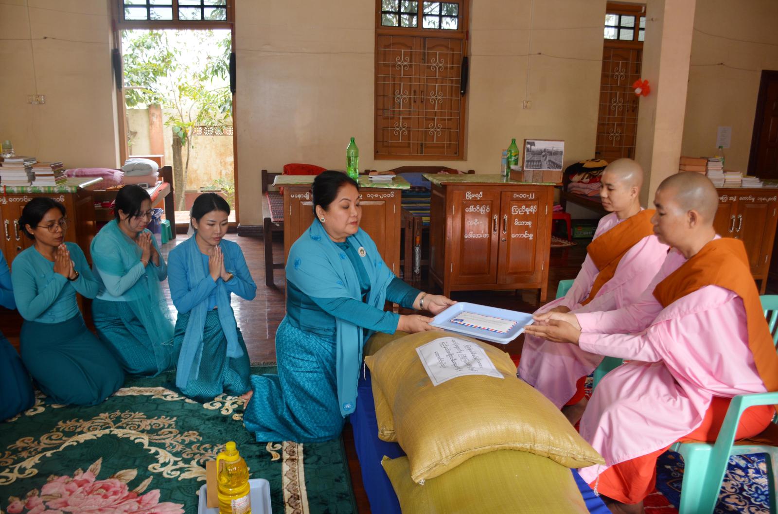 ထို့နောက် ကချင်ပြည်နယ် အမျိုးသမီးရေးရာအဖွဲ့နှင့် မိခင်နှင့်ကလေးစောင့်ရှောက်မှုကြီးကြပ်ရေးအဖွဲ့မှ နာယက ဒေါ်လဖိုင်နန်ဆိုင်းနှင့်အဖွဲ့သည် မိုးညှင်းမြို့ နားခါရပ်ကွက်ရှိ သာသနဟိတကာရီ သီလရှင်ကျောင်းတိုက်သို့သွားရောက်၍ သီလရှင်ဆရာကြီးများအား သာသနာရေးဆိုင်ရာများနှင့်ပတ်သက်၍ လျှောက်ထားပြီး သီလရှင်စာသင်သားများအတွက် အလှူငွေနှင့် ဆန်၊ ဆီ၊ ဆား၊ ဟင်းသီးဟင်းရွက်များကို လှူဒါန်းပေးအပ်ရာ သီလရှင်ဆရာကြီးက ဆုတောင်းမေတ္တာပို့သပေးခဲ့ကြောင်း သိရသည်။