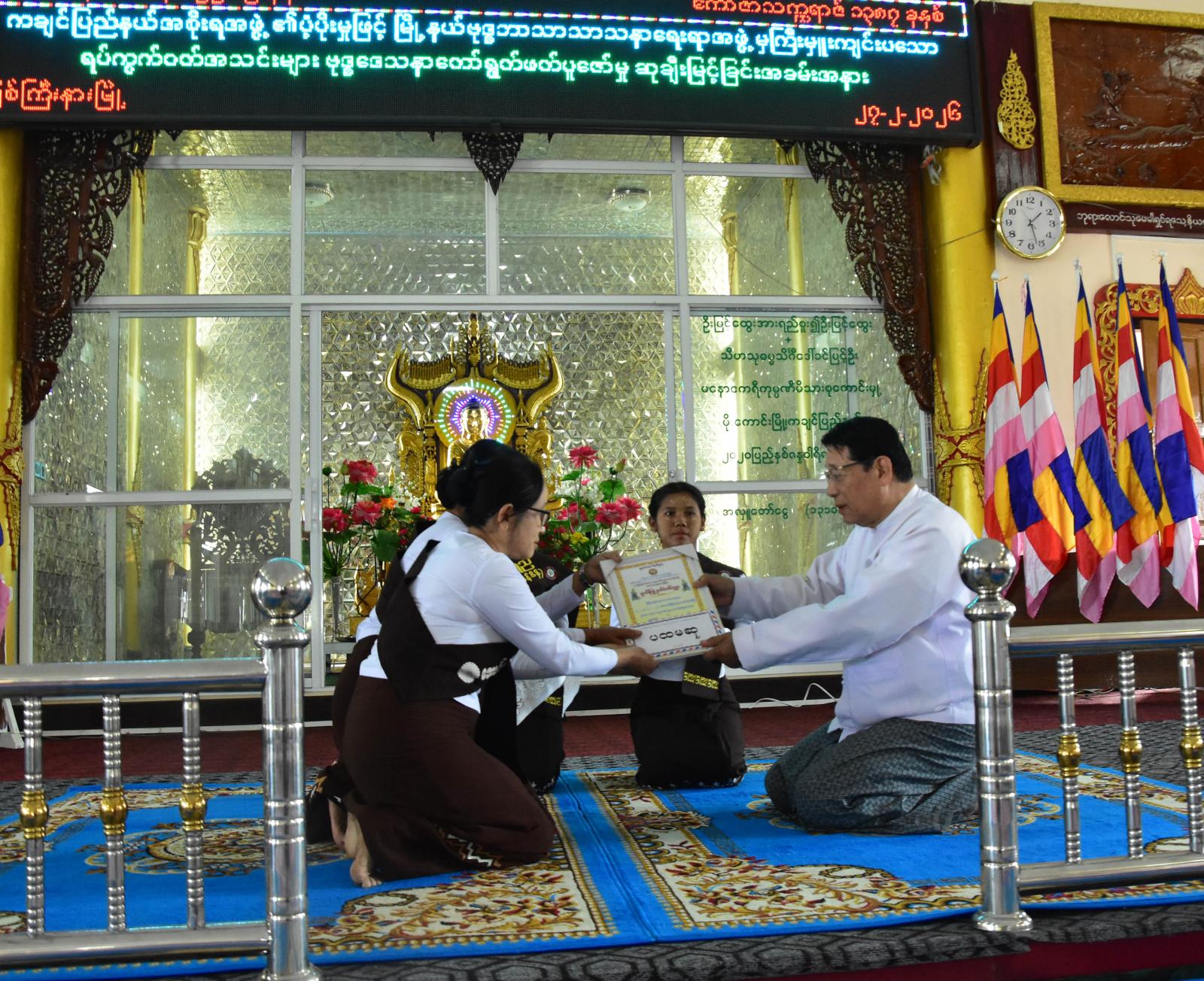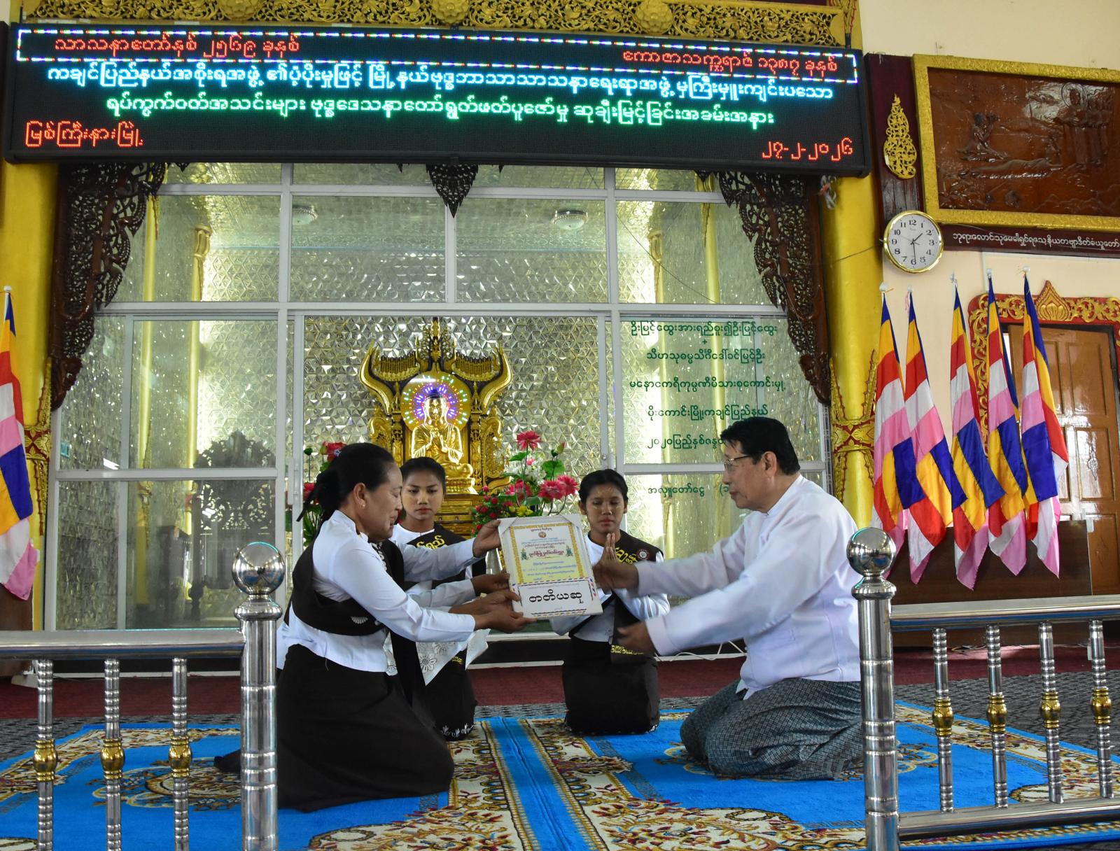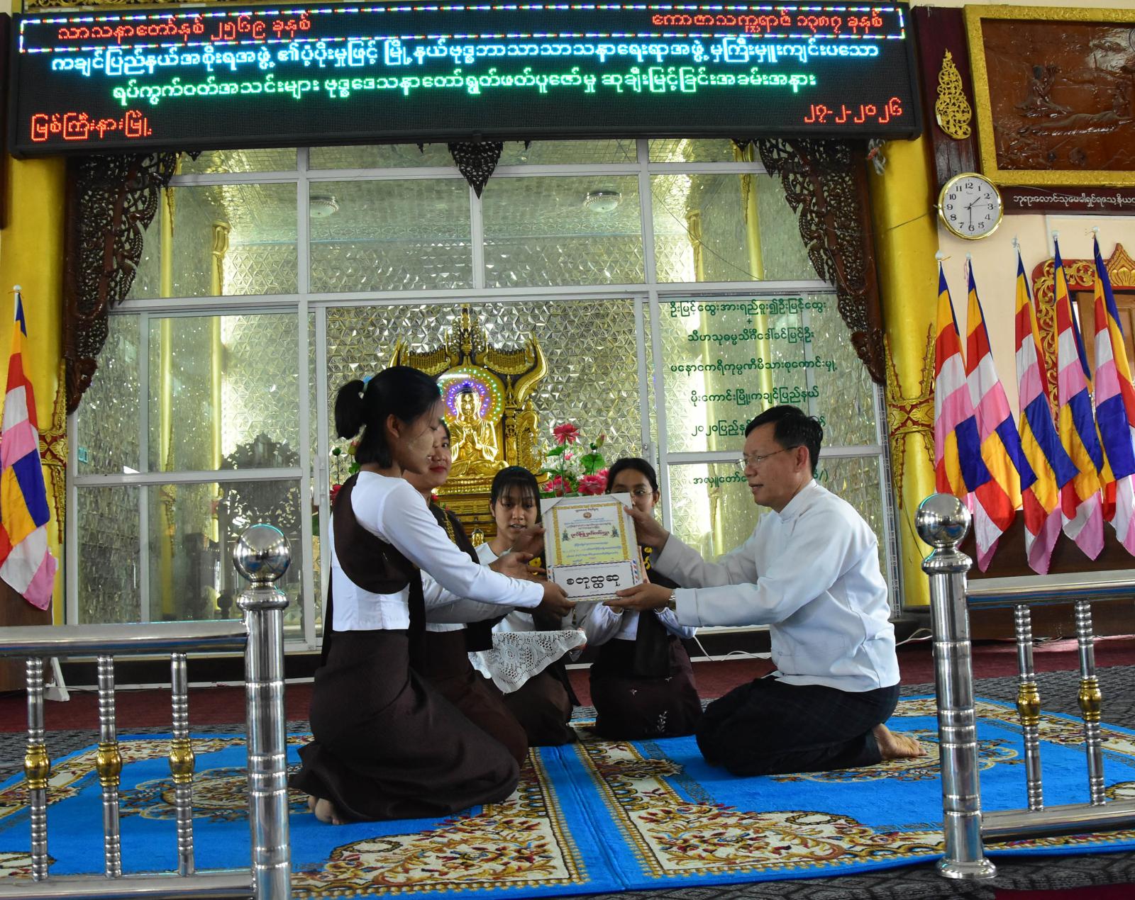 ထို့နောက် မြစ်ကြီးနားမြို့နယ် ဗုဒ္ဓဘာသာ သာသနာရေးရာအဖွဲ့ဥက္ကဋ္ဌက သာသနာရေးရာအဖွဲ့၏ ချမှတ်အကောင်အထည်ဖော် ဆောင်ရွက်လျက်ရှိသည့် လုပ်ငန်းစဉ်များနှင့်ပ တ်သက်၍ ရှင်းလင်းတင်ပြပြီး ပြည်နယ်စီးပွားရေးရာဝန်ကြီး ဦးမျိုးဆွေ၊ ပြည်နယ်လူမှုရေးရာဝန်ကြီး၊ ပြည်နယ် အဆင့်ဌာနဆိုင်ရာ တာဝန်ရှိသူများနှင့် အလှူရှင်များက အထူးဆု၊ ပထမဆု၊ ဒုတိယဆု၊ တတိယဆု၊ ဂုဏ်ပြုဆု၊ အင်အားအများဆုံးဆု၊ အမွှန်းရွတ်ဆိုမှု အကောင်းဆုံးဆုနှင့် သန့်ရှင်းသပ်ရပ်ဆုများ ရရှိခဲ့ကြသော ဝတ်အသင်းများအား ဂုဏ်ပြုမှတ်တမ်းလွှာနှင့် ဂုဏ်ပြုဆုငွေများကို အသီးသီးပေးအပ် ချီးမြှင့်ခဲ့ကြသည်။