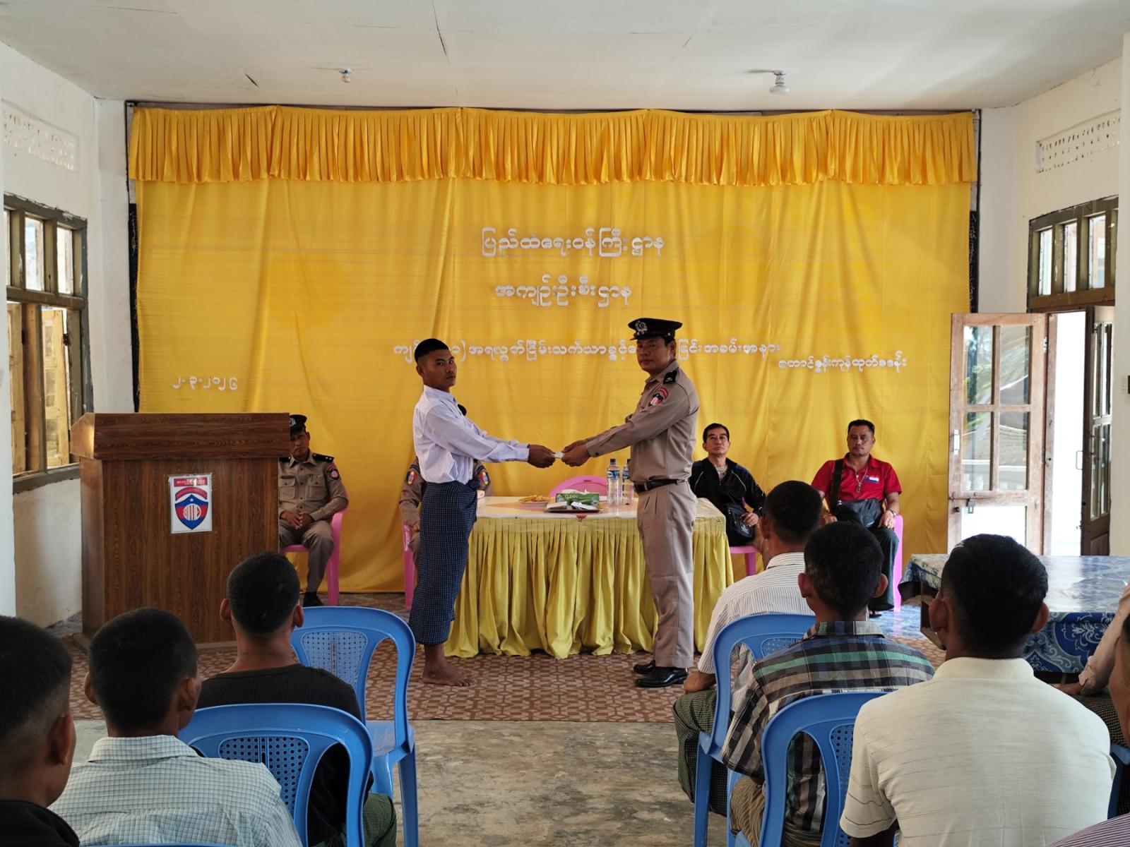 ရှေးဦးစွာ တောင်စွန်းကုန်ထုတ်စခန်းမှတာဝန်ခံအရာရှိ ဦးဇော်ရဲအောင်က လွတ်ငြိမ်းသက်သာခွင့်ရရှိသည့် အကျဉ်းသားများအား ရာဇဝတ် ကျင့်ထုံးဥပဒေပုဒ်မ ၄၀၁၊ ပုဒ်မခွဲ(၁)အရ ကျခံရန်ကျန်ရှိသည့် ပြစ်ဒဏ်များအပေါ် လျော့ပေါ့၍ ပြစ်ဒဏ်လွတ်ငြိမ်းချမ်းသာခွင့်ပေးခြင်းဖြစ်သည် ဟူသောစည်းကမ်း သတ်မှတ်ချက်အရ လွတ်ပေးခြင်းဖြစ်ကြောင်းနှင့် ဆုံးမစကားများပြောကြားပြီး ထောင်လွတ်လက်မှတ်နှင့်အတူ စားစရိတ်၊ ခရီးစရိတ်များ ပေးအပ်ခဲ့သည်။