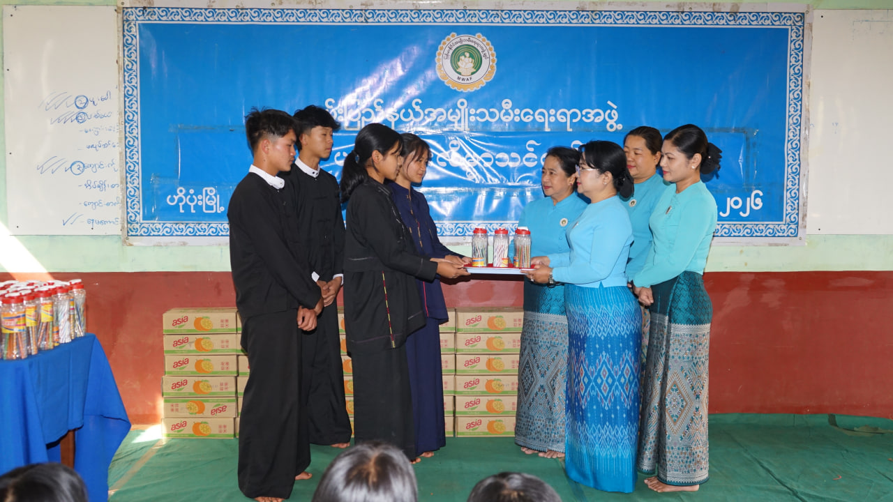 ရှမ်းပြည်နယ်(တောင်ပိုင်း)၊ ပအိုဝ်းကိုယ်ပိုင်အုပ်ချုပ်ခွင့်ရဒေသ၊ ဟိုပုံးမြို့နယ်၌ ရှမ်းပြည်နယ် အမျိုးသမီးရေးရာအဖွဲ့မှ နောင်တောင်းပရဟိတတပ်ဦးကျောင်းတွင် ယဉ်ကျေးလိမ္မာသင်တန်းသား၊ သင်တန်းသူများအတွက် စာရေးကိရိယာနှင့် အချိုရည်များ ပေးအပ်လှူဒါန်းခြင်းကို မတ် ၆ ရက်နေ့ မွန်းလွဲ ၂ နာရီက နောင်တောင်းပရဟိတတပ်ဦးကျောင်း၌ ပြုလုပ်သည်။