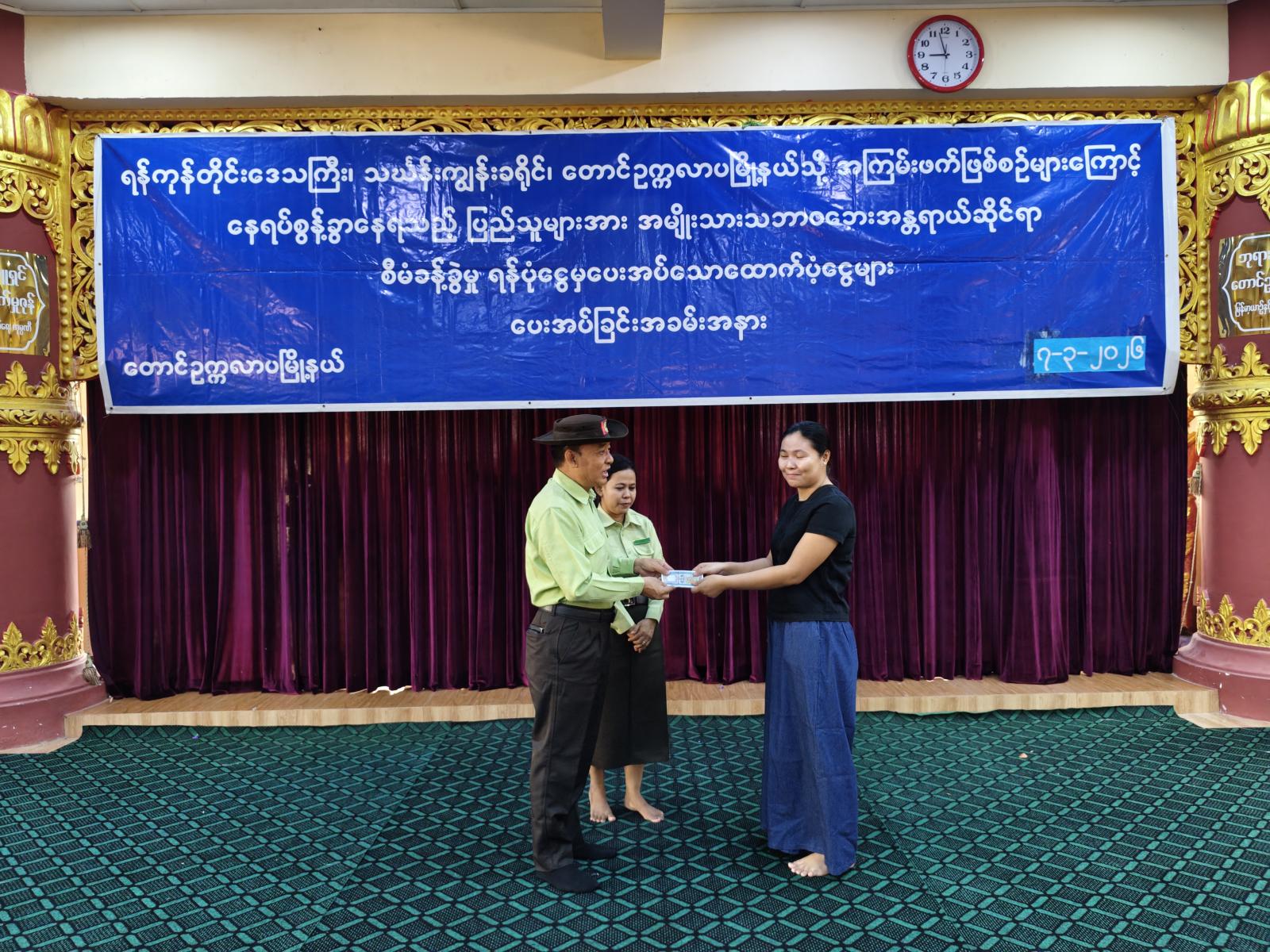 ရန်ကုန်တိုင်းဒေသကြီး၊ သင်္ဃန်းကျွန်းခရိုင်၊ တောင်ဥက္ကလာပမြို့နယ်အတွင်းသို့ ဒေသအသီးသီးမှ ယာယီနေရပ်စွန့်ခွာနေရသည့် ပြည်သူများအတွက် အမျိုးသားသဘာဝဘေးအန္တရာယ်ဆိုင်ရာ စီမံခန့်ခွဲမှုရန်ပုံငွေမှ ထောက်ပံ့ငွေပေးအပ်ပွဲအခမ်းအနားကို ယမန်နေ့နံနက်ပိုင်းက အမှတ် (၁၄) ရပ်ကွက် တောင်ဥက္ကလာပမြို့နယ်လုံးဆိုင်ရာ သုံးထပ်ဆောင်သာသနာ့ဗိမာန်တော်ကြီး၌ ကျင်းပခဲ့သည်။