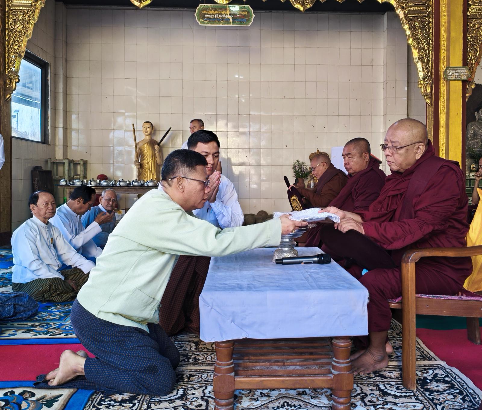 အခမ်းအနားတွင် “နမောတဿ”သုံးကြိမ်ရွတ်ဆို ဘုရားကန်တော့၍ မြို့နယ်သံဃနာယကအဖွဲ့ဥက္ကဋ္ဌဆရာတော်၊ သာယာအေးကျောင်းတိုက်ကြီး၏ ပဓာနနာယက၊ မဟာသဒ္ဓမ္မဇောတိကဓဇ၊ ဘဒ္ဒန္တစာရိတဆရာတော်အရှင်သူမြတ်ထံမှ ငါးပါးသီလခံယူဆောက်တည်ပြီး ဆရာတော်သံဃာတော်များ ရွတ်ပွားချီးမြှင့်တော်မူသော ပရိတ်တရားတော်များ နာယူခြင်းနှင့် လှူဖွယ်ဝတ္ထုများ ဆပ်ကပ်လှူဒါန်းခဲ့သည်။