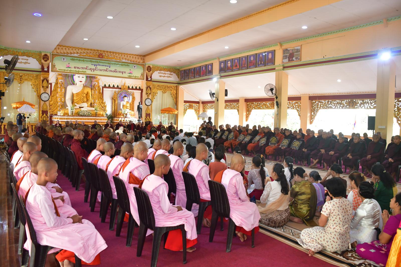 ထို့နောက် အဂ္ဂမဟာဂန္ထဝါစကပဏ္ဍိတ နိုင်ငံတော်ဗဟိုသံဃာ့ဝန်ဆောင် မဟာဓမ္မိကာရာမ အုန်းတောကျောင်းတိုက် ပဓာနနာယက ဆရာတော် ဘဒ္ဒန္တတိဿအရှင်သူမြတ်ထံမှ အနုမောဒနာတရား နာယူကာလှူဒါန်းမှုအစုစုတို့အတွက် ရေစက်သွန်းချ အမျှပေးဝေခဲ့ကြပြီး အခမ်းအနားကို ဗုဒ္ဓသာသနံစိရံတိဋ္ဌတု သုံးကြိမ်ရွတ်ဆိုဆုတောင်း၍ ရုတ်သိမ်းခဲ့ပြီးနောက် နာယကဆရာတော်ကြီးများ၊ စာအောင်သံဃာတော်များနှင့် သီလရှင်များအား အလှူရှင်များက လှူဖွယ်ဝတ္ထုပစ္စည်းများ လောင်းလှူခဲ့ကြသည်။