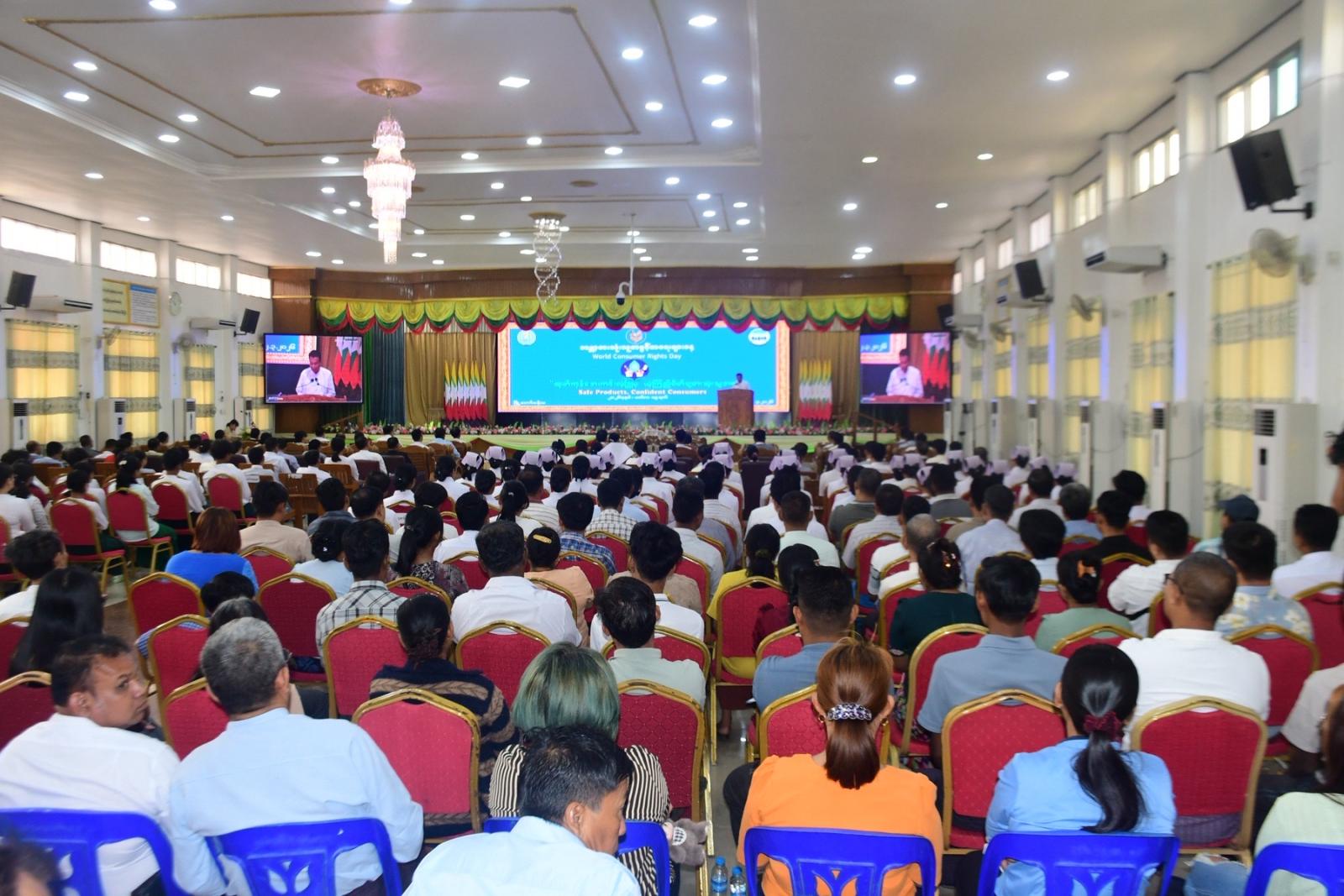 ရှေးဦးစွာ ပဲခူးတိုင်းဒေသကြီးအစိုးရအဖွဲ့ စီးပွားရေးရာဝန်ကြီး ဦးတင်ဦးက “ ကမ္ဘာ့စားသုံးသူအခွင့်အရေးများနေ့” အထိမ်းအမှတ်အခမ်းအနားကို မြန်မာနိုင်ငံစားသုံးသူကာကွယ်ရေးကော်မရှင်က ဦးဆောင်၍ ၂၀၁၆ ခုနှစ်မှ စတင်ပြီး နှစ်စဉ်ကျင်းပပြုလုပ်ခဲ့ရာ ဒီနှစ်မှာတော့ အပြည်ပြည်ဆိုင်ရာ စားသုံးသူများအဖွဲ့က သတ်မှတ်ထုတ်ပြန်တဲ့ “ထုတ်ကုန်ဘေးကင်းလုံခြုံမှ ယုံကြည်စိတ်ချ စားသုံးသူဘဝ” ဆောင်ပုဒ်နှင့်အညီ ကမ္ဘာ့စားသုံးသူ အခွင့်အရေးများနေ့ အထိမ်းအမှတ် အခမ်းအနားကို ယခုလိုကျင်းပရခြင်းဖြစ်ကြောင်း၊ စားသုံးသူအခွင့်အရေးများကို ကမ္ဘာ့နိုင်ငံအသီးသီးမှာ အလေးထားကြပြီး မတ်လ ၁၅ ရက်နေ့ကို ကမ္ဘာ့စားသုံးသူအခွင့်အရေးများနေ့အဖြစ် သတ်မှတ်ကျင်းပဆောင်ရွက်လျက်ရှိကာ မြန်မာနိုင်ငံတွင်လည်း အခြားကမ္ဘာ့နိုင်ငံများနည်းတူ စားသုံးသူကာကွယ်ရေးလုပ်ငန်းများ ဆောင်ရွက်ရန် စီးပွားရေးနှင့်ကူးသန်းရောင်းဝယ်ရေးဝန်ကြီးဌာန၊ စားသုံးသူရေးရာဦးစီးဌာနကို ဖွဲ့စည်းတာဝန်ပေးအပ်ထားရှိပြီး ပြည်ထောင်စု အဆင့်အနေဖြင့်လည်း မြန်မာနိုင်ငံစားသုံးသူကာကွယ်ရေးကော်မရှင်ကို ဖွဲ့စည်းထားပါတယ်။ တိုင်းဒေသကြီးစားသုံးသူရေးရာကော်မတီကိုလည်း တိုင်းဒေသကြီးအစိုးရအဖွဲ့ဝင် စီးပွားရေးရာဝန်ကြီး ဦးဆောင်ပြီး ဌာနဆိုင်ရာများဖြင့် ဖွဲ့စည်း၍ စားသုံးသူကာကွယ်ရေးလုပ်ငန်းများကို အကောင်အထည်ဖော်ဆောင်ရွက်လျက်ရှိကြောင်း၊ နိုင်ငံတော်မှ ချမှတ်ထားသည့် ဆောင်ပုဒ် (၃) ခုအနက် “ နိုင်ငံတော်ရွှေသီးဖို့ ကုန်ထုတ်လုပ်မှု အားပေးစို့” ဆောင်ပုဒ်အတိုင်း နိုင်ငံ့စီးပွားဖွံ့ဖြိုး တိုးတက်စေရေးအတွက် ကုန်ထုတ်လုပ်မှုလုပ်ငန်းများ အားပေးဆောင်ရွက်လျက်ရှိရာ စက်မှုကဏ္ဍ ဖွံ့ဖြိုးတိုးတက်ရေး၊ အသေးစား၊ အငယ်စားနှင့် အလတ်စား MSMEs စီးပွားရေးလုပ်ငန်းများ ဖွံ့ဖြိုးတိုးတက်ရေးနှင့် သွင်းကုန်အစားထိုးထုတ်ကုန်များ တိုးမြှင့်ထုတ်လုပ်ခြင်း၊ ပြည်ပပို့ကုန်များ တိုးမြှင့်ထုတ်လုပ် တင်ပို့ခြင်းဖြင့် နိုင်ငံတော်၏ စီးပွားရေးကို ရေရှည်ဖွံဖြိုးတိုးတက်လာစေမှာဖြစ်ပြီး လုပ်ငန်းရှင်များအနေဖြင့်လည်း နိုင်ငံတော်မှ ချမှတ်ထားသည့် ဥပဒေ၊ မူဝါဒ၊ ညွှန်ကြားချက်များနှင့်အညီ အတ္တပရမျှတစွာဖြင့် နိုင်ငံ့စီးပွားမြင့်တက်လာစေရေး ဆောင်ရွက်ပေးကြရန်၊ “ထုတ်ကုန်ဘေးကင်းလုံခြုံမှ ယုံကြည်စိတ်ချ စားသုံးသူဘဝ” ဟူသော ဆောင်ပုဒ်နှင့်အညီ စားသုံးသူများ အနေဖြင့် ဘေးအန္တရာယ်ကင်းရှင်းစေပြီး ယုံကြည်စိတ်ချရသော ထုတ်ကုန်များ၊ ဝယ်ယူသုံးစွဲနိုင်ရေးတို့အတွက် စီးပွားရေးလုပ်ငန်းရှင်များ သက်ဆိုင်ရာဌာန အဖွဲ့အစည်းများ၊ ပြည်သူများ ပူးပေါင်း၍ ဟန်ချက်ညီညီ စဉ်ဆက်မပြတ် ဆက်လက်ဆော