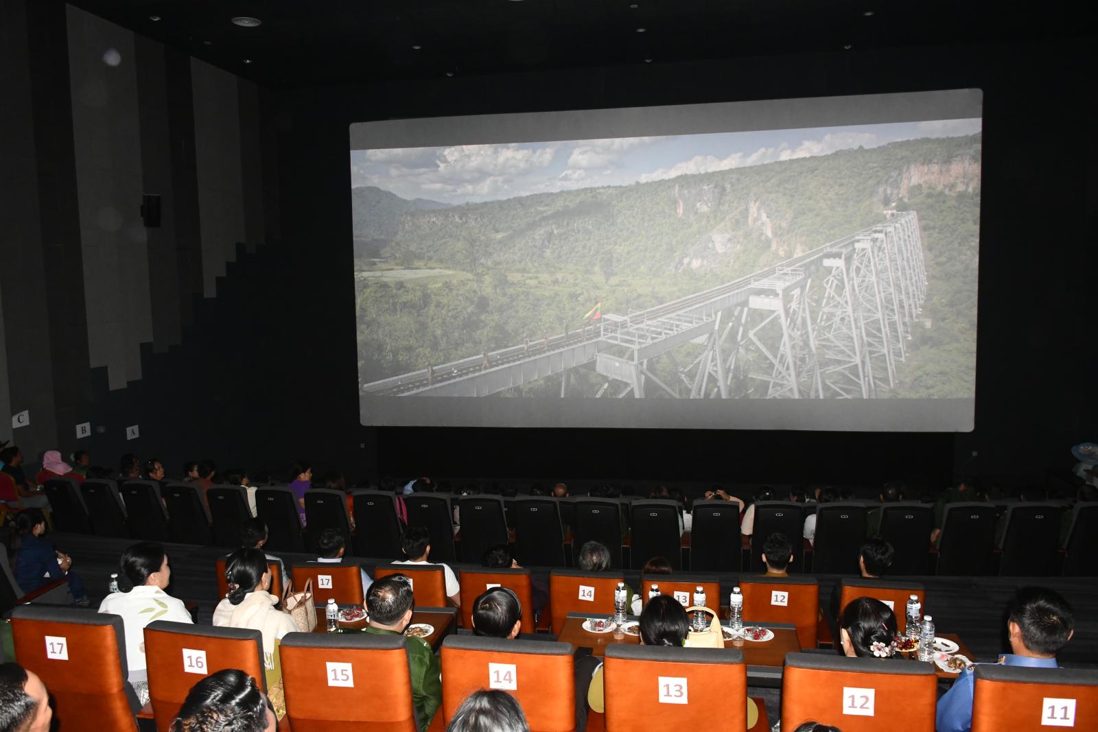 ယင်းနောက် ရန်ကုန်တိုင်းဒေသကြီးဝန်ကြီးချုပ် ဦးစိုးသိန်းနှင့် တာဝန်ရှိသူများက တိမ်ပင်လယ်ခရီးကြမ်း (Battle Of Taung Hkam) ရုပ်ရှင်ဇာတ်ကားပြသမှုကို ကြည့်ရှုအားပေးကြသည်။