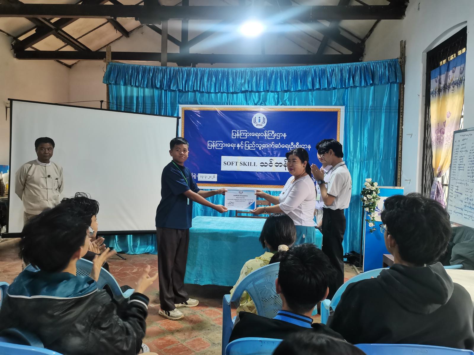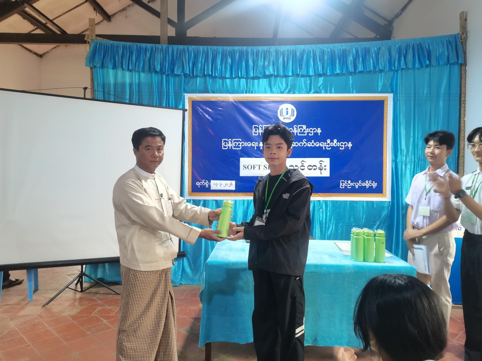 ဆက်လက်၍ သင်တန်းတွင် သင်တန်းထူးချွန်ဆု(၁၀)ဆုနှင့် ခေါင်းဆောင်မှုအကောင်းဆုံးဆု (၈)ဆု ရရှိသော ဆုရကျောင်းသား/ကျောင်းသူများအား တာ၀န်ရှိသူများက ဂုဏ်ပြုဆုလက်ဆောင်များနှင့် သင်တန်းဆင်းဂုဏ်ပြုကတ်များအား အသီးသီးပေးအပ်ချီးမြှင့်ခဲ့သည်။