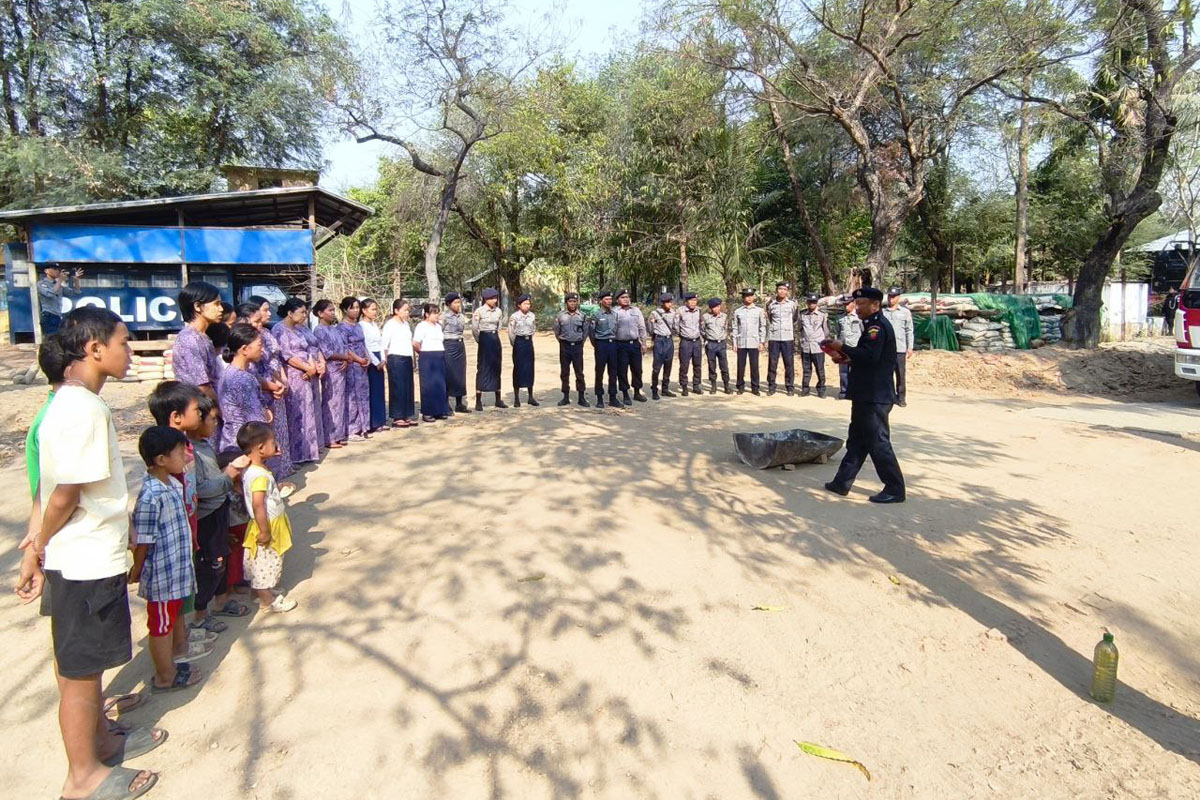 ဦးစွာ မီးလေးလုံခြုံရေး အသိပညာပေးဟောပြောပွဲ၌ မြို့နယ်မီးသတ်ဦးစီးဌာနမှူး ဦးစီးအရာရှိ ဦးကျော်ဇင်သန့်က မီးဘေးလုံခြုံရေး အသိပညာပေးဟောပြောပြီး မီးဘေးကြိုတင်ကာကွယ်ရေး လက်တွေ့သရုပ်ပြခြင်းကို ဆောင်ရွက်ရာ လာရောက်လေ့လာကြည့်ရှုကြသည့် ရဲတပ်ဖွဲ့ဝင် (၂၀)ဦး၊ အိမ်ထောင်သည် လိုင်းခန်းမှ မိသားစုဝင်(၁၅)ဦးတို့အား မြိုနယ်မီးသတ်ဦးစီးမှူးက မီးငြှိမ်းသတ်ရာ တွင် ရေစိုအဝတ်သုံးစွဲပုံတို့ကို ရှင်းလင်းဆွေးနွေးပြောကြားပြီး မီးငြှိမ်းသတ်ရာတွင် ရေစိုအဝတ်တို့ အသုံးပြုပြီး မီးငြှိမ်းသတ်ခြင်းကို ရဲတပ်ဖွဲ့ဝင်များနှင့် မိသားစုဝင်များကိုယ်တိုင်လက်တွေ့ သရုပ်ပြစေခဲ့သည်။