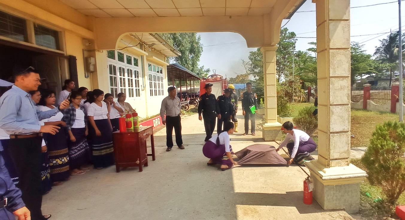 ထို့နောက် မီးသတ်တပ်ဖွဲ့ဝင်များနှင့် ကျေးလက်ဒေသဖွံ့ဖြိုးတိုးတက်ရေးဦးစီးဌာနဝန်ထမ်းများ ပူးပေါင်းကာ မီးသတ်ဆေးဘူးဖြင့် ငြှိမ်းသတ်ခြင်း၊ အောက်ဆီဂျင်ဖြတ် ဖုံးအုပ်မီးငြှိမ်းသတ်ခြင်းတို့ကို ဇာတ်တိုက်လေ့ကျင့်ခြင်းများ ဆောင်ရွက်ခဲ့ကြောင်း သိရသည်။