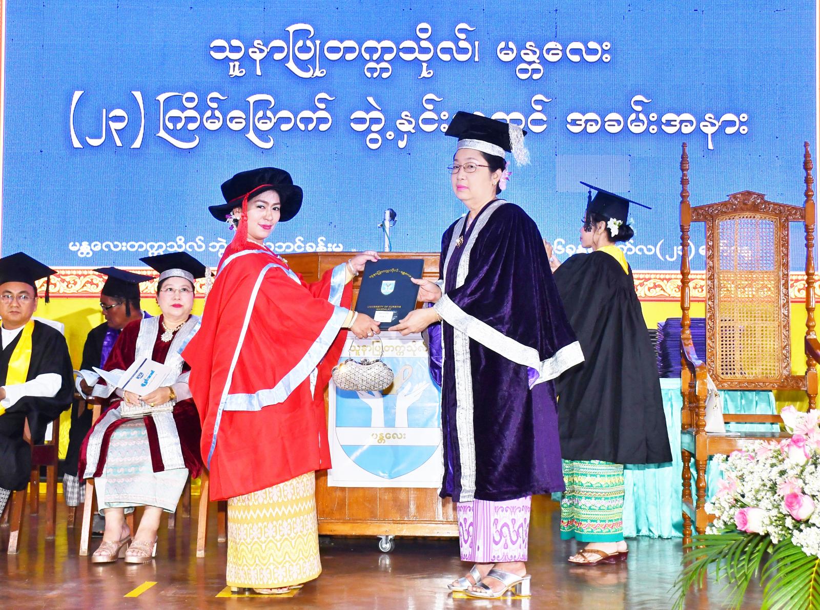 အခမ်းအနားတွင် သူနာပြုတက္ကသိုလ်(မန္တလေး) ပါမောက္ခချုပ် ပါမောက္ခ ဒေါက်တာခင်ဝင်းစိန်က သူနာပြုပါရဂူဘွဲ့၊ သူနာပြုမဟာသိပ္ပံဘွဲ့၊ အထူးပြုသူနာပြုဒီပလိုမာဘွဲ့နှင့် သူနာပြုသိပ္ပံဘွဲ့များအတွက် သက်ဆိုင်ရာဘွဲ့များ အပ်နှင်းသည်။