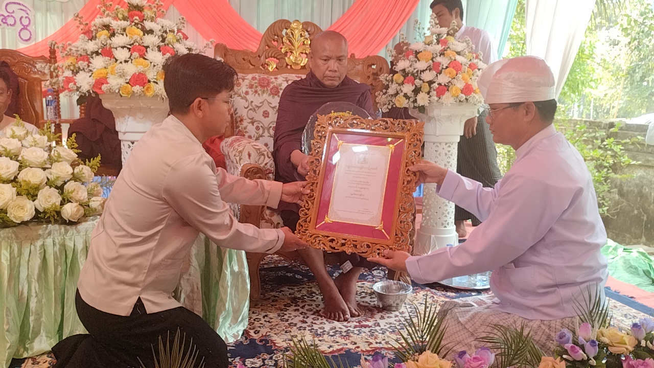 ထို့နောက် ကျုံပျော်ခရိုင် စီမံခန့်ခွဲရေးနှင့် အုပ်ချုပ်ရေးကော်မတီ ဥက္ကဋ္ဌ ဦးစောထွန်းဝင်းက ဂန္ထဝါစကပဏ္ဍိတ ဘွဲ့တံဆပ်တော်အား ဆရာတော် ဘဒ္ဒန္တစန္ဒာဝရထံ ထပ်ဆင့် ဆက်ကပ်လှူဒါန်းပြီး၊ မင်းကျောင်းဆရာတော် ဘဒ္ဒန္တ တေဇိန္ဒ ထံမှ ငါးပါးသီလ ခံယူဆောက်တည်ကြသည်။