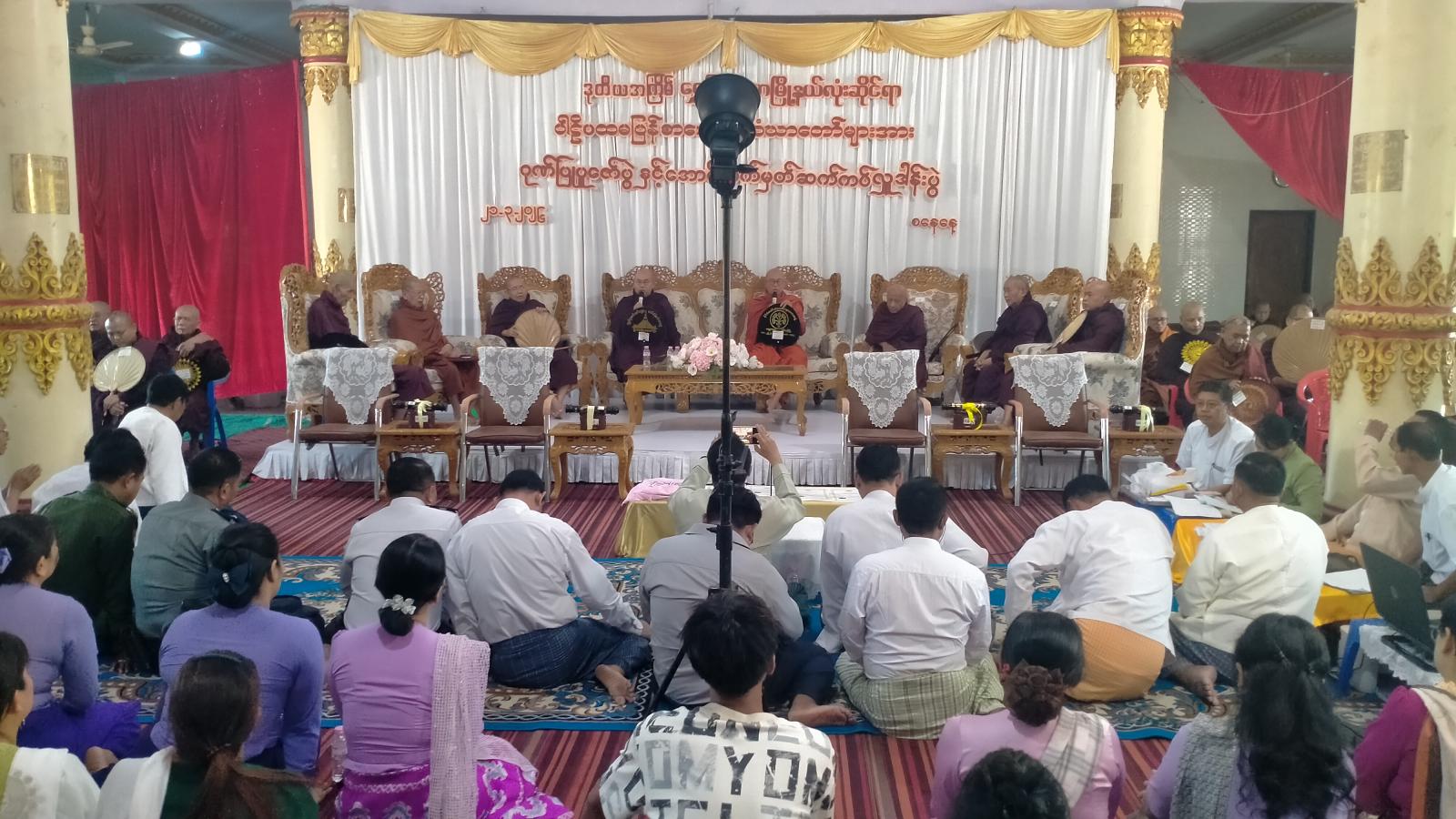 ဆက်လက်၍ မြို့နယ်စီမံခန့်ခွဲရေးနှင့်အုပ်ချုပ်ရေး ကော်မတီဥက္ကဋ္ဌ ဦးမြင့်ဦးက ၂၀၂၆ ခုနှစ် စာအောင်သံဃာတော်များအား ဆုချီးမြှင့်ခြင်း၊ အောင်လက်မှတ်ဆပ်ကပ်ခြင်းနှင့်ပတ်သက်၍ သာသနာ့ရေးဆိုင်ရာများ လျှောက်ထားပြီး ရွှေပြည်သာပရိယတ္တိ ကျောင်းဆရာတော်ထံမှ စူဠဘွဲ့နှင်းသဘင်ချီးမြှင့်ခြင်း ရေစက်ချအနုမောတနာတရားနာယူကြသည်။