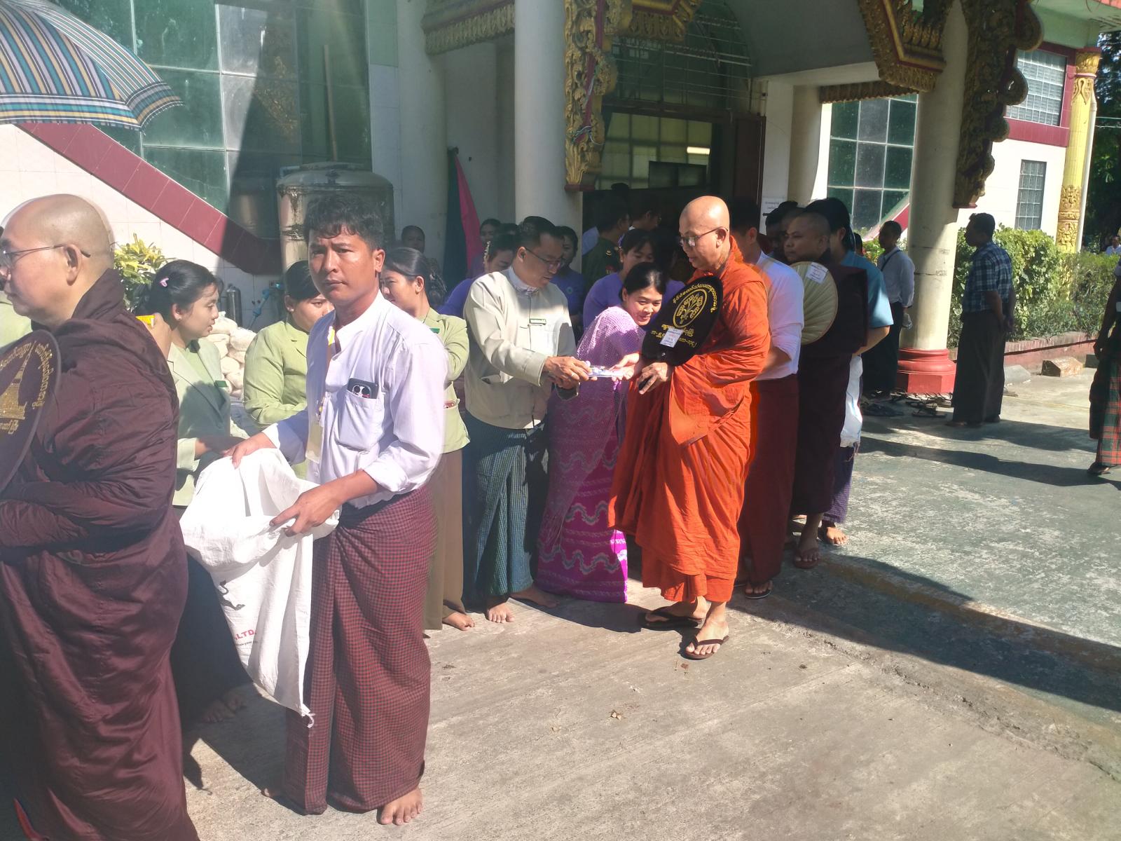 ထို့နောက် မြို့နယ်စီမံခန့်ခွဲရေးနှင့်အုပ်ချုပ်ရေး ကော်မတီဥက္ကဋ္ဌ ဦးမြင့်ဦးနှင့်အဖွဲ့ဝင်များ၊ ဌာနဆိုင်ရာအကြီးအကဲများ၊ မြို့နယ်အမျိုးသမီးရေးရာအဖွဲ့ဥက္ကဋ္ဌ ဒေါ်ယဉ်မေသွယ်နှင့် အဖွဲ့ဝင်များ၊ အလှူရှင်များက စာအောင်လက်မှတ်နှင့် လှူဖွယ်ဝတ္တူငွေများကို ဆက်ကပ်လှူဒါန်းခဲ့ကြပြီး ကြွရောက်တော်မူလာကြကုန်သော် ဆရာတော်ကြီး (၃၃) ပါး၊ စာအောင်သံဃာတော်များ၊ သီလရှင်ဆရာလေးများ (၁၀၉) ပါး စုစုပေါင်း (၁၄၂) ပါတို့အား ဆွမ်းဆန်စိမ်းလောင်းလှူခဲ့ကြကြောင်း သိရသည်။