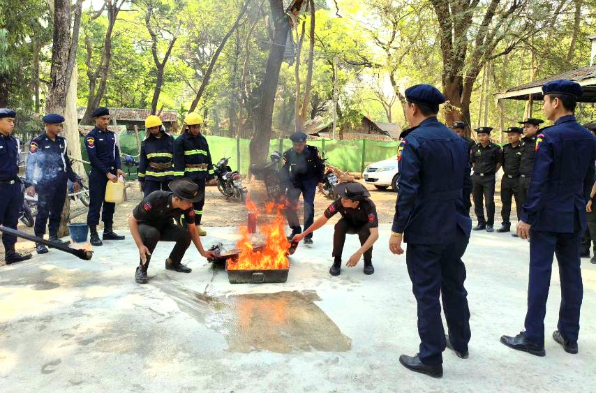 ထို့နောက် မြို့နယ်မီးသတ်ဦးစီးမှူးနှင့် မီးသတ်တပ်ဖွဲ့ဝင်များက လူဝင်မှုကြီးကြပ်ရေးနှင့်ပြည်သူ့အင်အားဝန်ကြီးဌာန မြို့နယ်ဦးစီးမှူးရုံးမှ ဝန်ထမ်းများအား မီးဘေးအန္တရာယ် ကြုံတွေ့လာပါက စနစ်တကျ မီးငြှိမ်းသတ်နိုင်ရန် မီးငြှိမ်းသတ်ပစ္စည်းများ အသုံးပြု၍ မီးငြှိမ်းသတ်ခြင်း၊ ရေစိုဝတ်ဖြင့် မီးငြှိမ်းသတ်ခြင်းနှင့် မီးသတ်ဆေးဘူးဖြင့် မီးငြှိမ်းသတ်နည်းစနစ်များကို ဇာတ်တိုက်လေ့ကျင့် သရုပ်ပြသရာ ဝန်ထမ်းများအဖွဲ့က ပူးပေါင်းပါဝင်လေ့ကျင့်ဆောင်ရွက်ခဲ့ကြကြောင်း သိရသည်။
