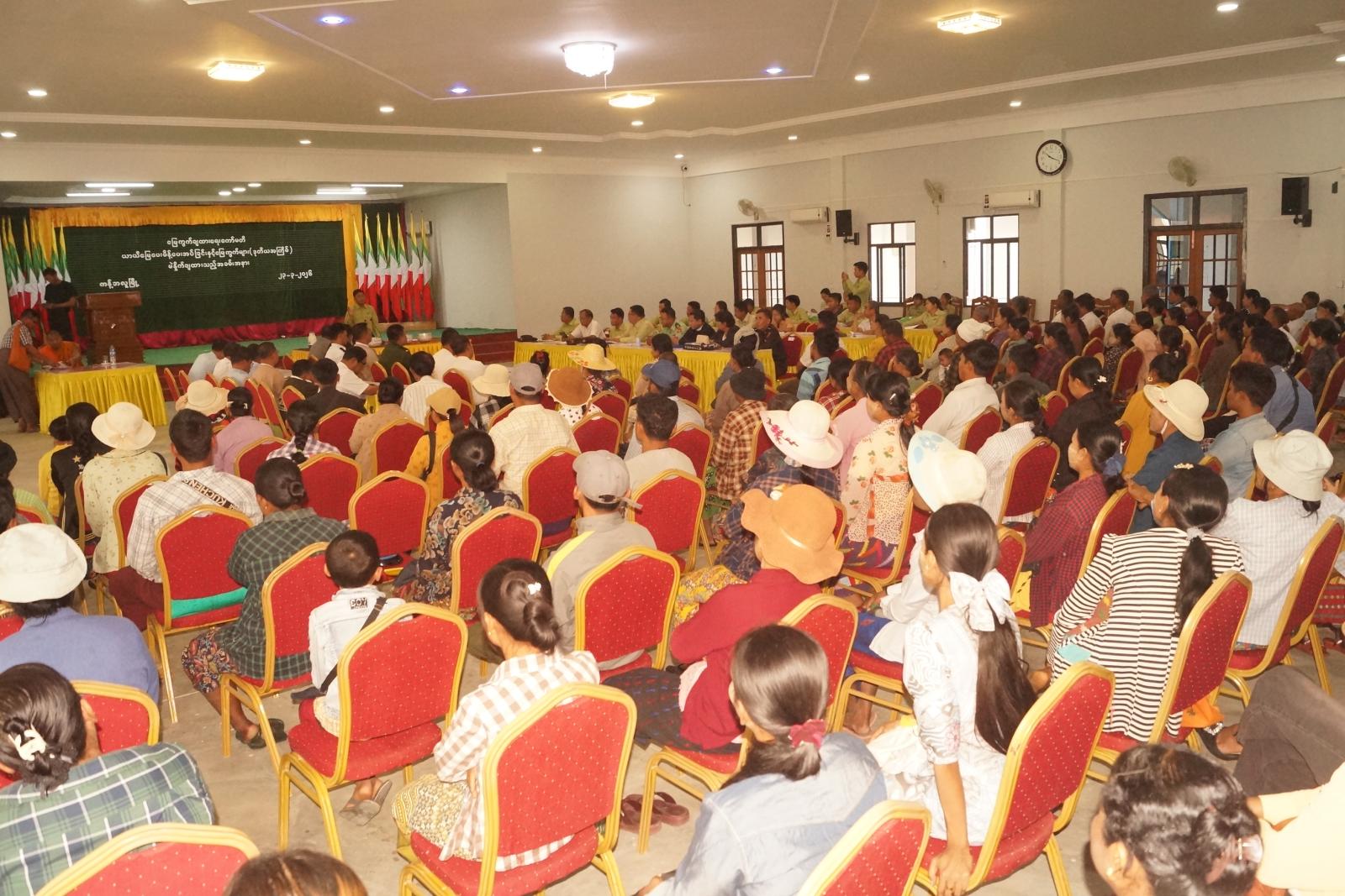 ရှေးဦးစွာ အမှတ်(၃)ရပ်ကွက် သာသနာ့အလင်းရောင်ကျောင်းတိုက် ဆရာတော်(ငါးရာ့ ငါးဆယ်)ဘဒ္ဒန္တဝါသဝက ဩဝါဒစကားမိန့်ကြားပြီး ခရိုင်စီမံခန့်ခွဲရေးနှင့်အုပ်ချုပ်ရေးကော်မတီဥက္ကဋ္ဌ ဦးကိုကိုလှိုင်က မြေယာဖော်ထုတ်ရေး၊ မြေကွက်များချထားပေးနိုင်ရေးနှင့် ပထမအကြိမ် မြေကွက်ချထားပေးမှုအခြေအနေများကို ရှင်းလင်းပြောကြားခဲ့သည်။
