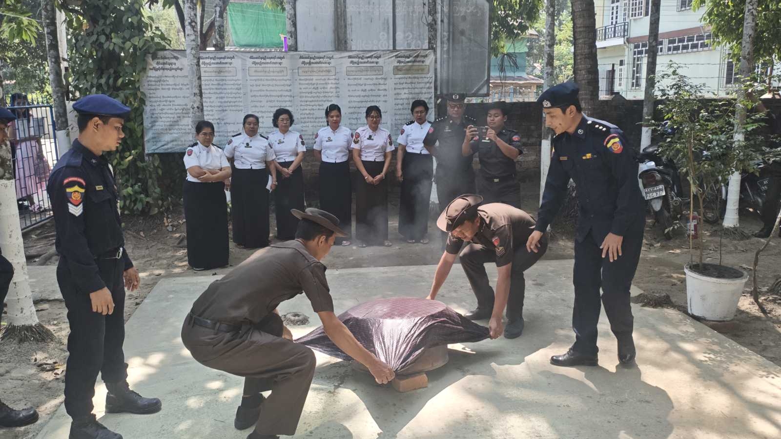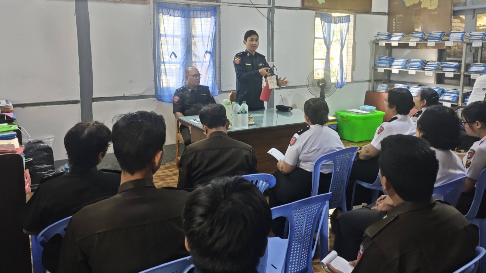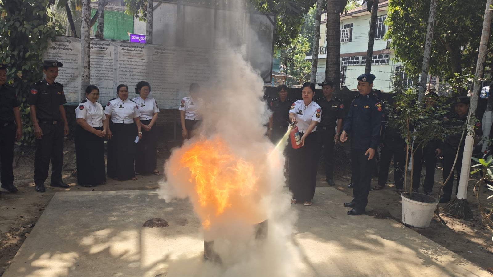 ထိုသို့ဆောင်ရွက်ရာတွင် မြို့နယ်မီးသတ်ဦးစီးဌာန၊ ဦးစီးအရာရှိ ဦးမျိုးမင်းသူက မီးဘေးအန္တရာယ် ကြိုတင်ကာကွယ်ရေးသရုပ်ပြ ဇာတ်တိုက်လေ့ကျင့်ခြင်း ရည်ရွယ်ချက်၊ မီးဘေးအန္တရာယ်ကြိုတင် ကာကွယ်ရေးအတွက် မီးငြှိမ်းသတ်ခြင်းဆိုင်ရာ အသိပညာပေးအကြောင်းအရာများနှင့် မီးသတ်ဆေးဘူး သုံးစွဲနည်းများကို ရှင်းလင်းပြောကြား၍ မြို့နယ်မီးသတ်တပ်ဖွဲ့ဝင်များက ဝန်ထမ်းများနှင့်အတူ မီးသတ်ဆေးဘူး အသုံးပြုခြင်း၊ မီးငြှိမ်းသတ်ခြင်းတို့ကို လက်တွေ့သရုပ်ပြ ဇာတ်တိုက်လေ့ကျင့်ခဲ့ကြောင်း သိရသည်။