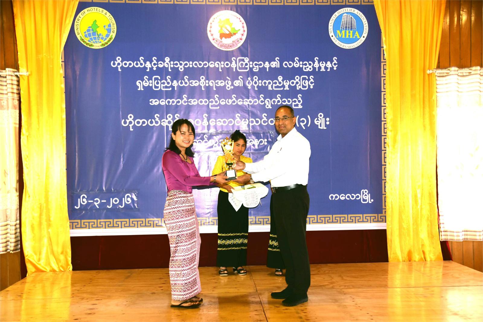 ထို့နောက် ပြည်နယ်ဝန်ကြီးချုပ် ဦးအောင်အောင် ပြည်နယ်လမ်းပန်းဆက်သွယ်ရေးဝန်ကြီး၊ ပြည်နယ်ဥပဒေချုပ်တို့က သင်တန်းများတွင် ပထမ၊ ဒုတိယ၊ တတိယဆုရရှိသူများအား ဆုများချီးမြှင့်ပေးကြပြီး သင်တန်းနည်းပြများအား ဂုဏ်ပြုလက်မှတ်နှင့် ချီးမြှင့်ငွေများ ပေးအပ်ချီးမြှင့်ပြီး သင်တန်းဆင်းလက်မှတ်များကို ဟိုတယ်နှင့်ခရီးသွားလာရေးဦးစီးဌာန ညွှန်ကြားရေးမှူးနှင့် တာဝန်ရှိသူများက ပေးအပ်ခဲ့ကြကြောင်း သိရှိရသည်။