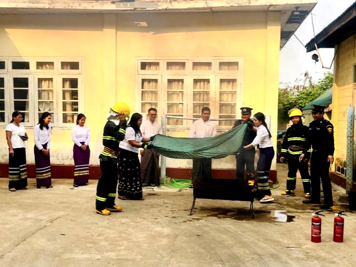 ထို့နောက် မြို့နယ်ကျေးလက်ဒေသ ဖွံ့ဖြိုးတိုးတက်ရေးဦးစီးဌာန ဝန်ထမ်းမိသားစုများအား မီးဘေးအန္တရာယ် ကြိုတင်ကာကွယ်နိုင်စေရန်အတွက် မြို့နယ်မီးသတ်ဦးစီးဌာန ဦးစီးမှူးနှင့် တပ်ဖွဲ့ဝင်များက လက်တွေ့မီးငြှိမ်းသတ်ခြင်း၊ မီးသတ်ဆေးဘူးဖြင့် မီးငြှိမ်းသတ်ခြင်းတို့ကို လက်တွေ့သရုပ်ပြ ဇာတ်တိုက်လေ့ကျင့် ဆောင်ရွက်ပေးခဲ့ကြောင်း သိရသည်။
