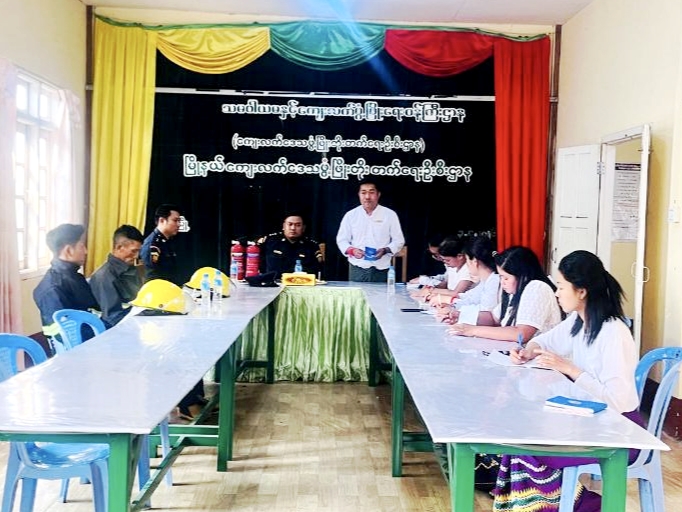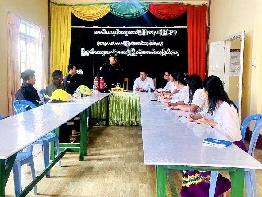 ဦးစွာ မြို့နယ်ကျေးလက်ဒေသဖွံ့ဖြိုးတိုးတက်ရေးဦးစီးဌာနဦးစီးမှုး ဦးမောင်ခိုင်က မီးဘေးအန္တရာယ် ကြိုတင်ကာကွယ်ရေးလုပ်ငန်းများ ဆောင်ရွက်ရခြင်းနှင့် စပ်လျဉ်း၍ ရှင်းလင်းပြောကြားခဲ့ပြီး မြို့နယ်မီးသတ်ဦးစီးဌာန ဦးစီးအရာရှိ ဦးကျော်ကိုကိုသက်က မီးဘေးလုံခြုံရေး ကြိုတင်ဆောင်ရွက်ထားရှိရမည့် အချက်များ၊ မီးသတ်ဆေးဘူး အသုံးပြုနည်းအကြောင်းများကို အသိပညာပေး ဟောပြောခဲ့သည်။