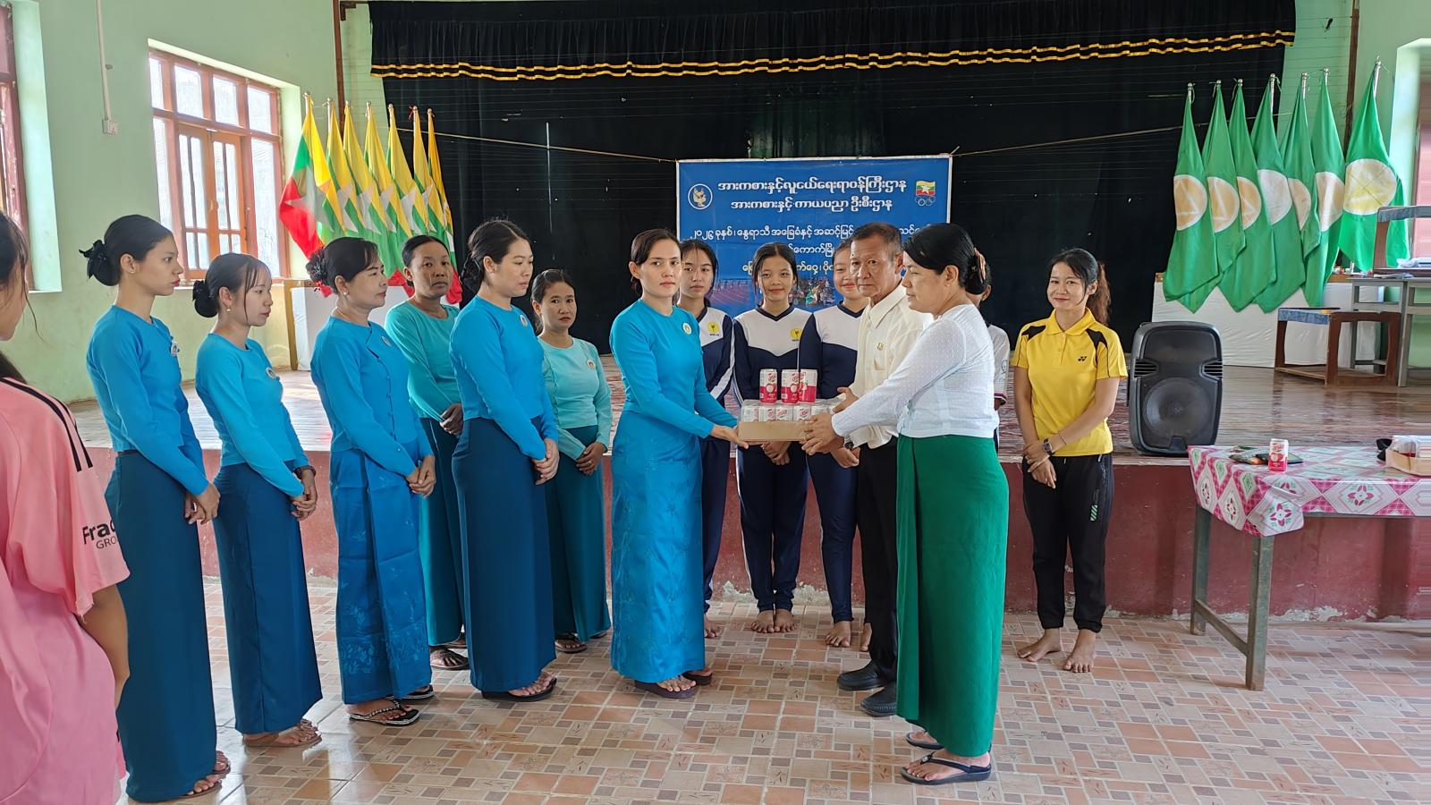 သင်တန်းဆင်းပွဲတွင် ကျောင်းသားကျောင်းသူများ၏ အေရိုးဗစ်သရုပ်ပြမှုကို မြို့နယ် စီမံခန့်ခွဲရေးနှင့်အုပ်ချုပ်ရေးကော်မတီဥက္ကဋ္ဌ ဦးအောင်ဇော်မင်း မြို့နယ်အမျိုးသမီးရေးရာအဖွဲ့ဥက္ကဋ္ဌ ဒေါ်နေဇင်ယုတို့က ကြည့်ရှုအားပေးပြီး အားဖြည့်အချိုရည်များ တိုက်ကျွေးသည်။