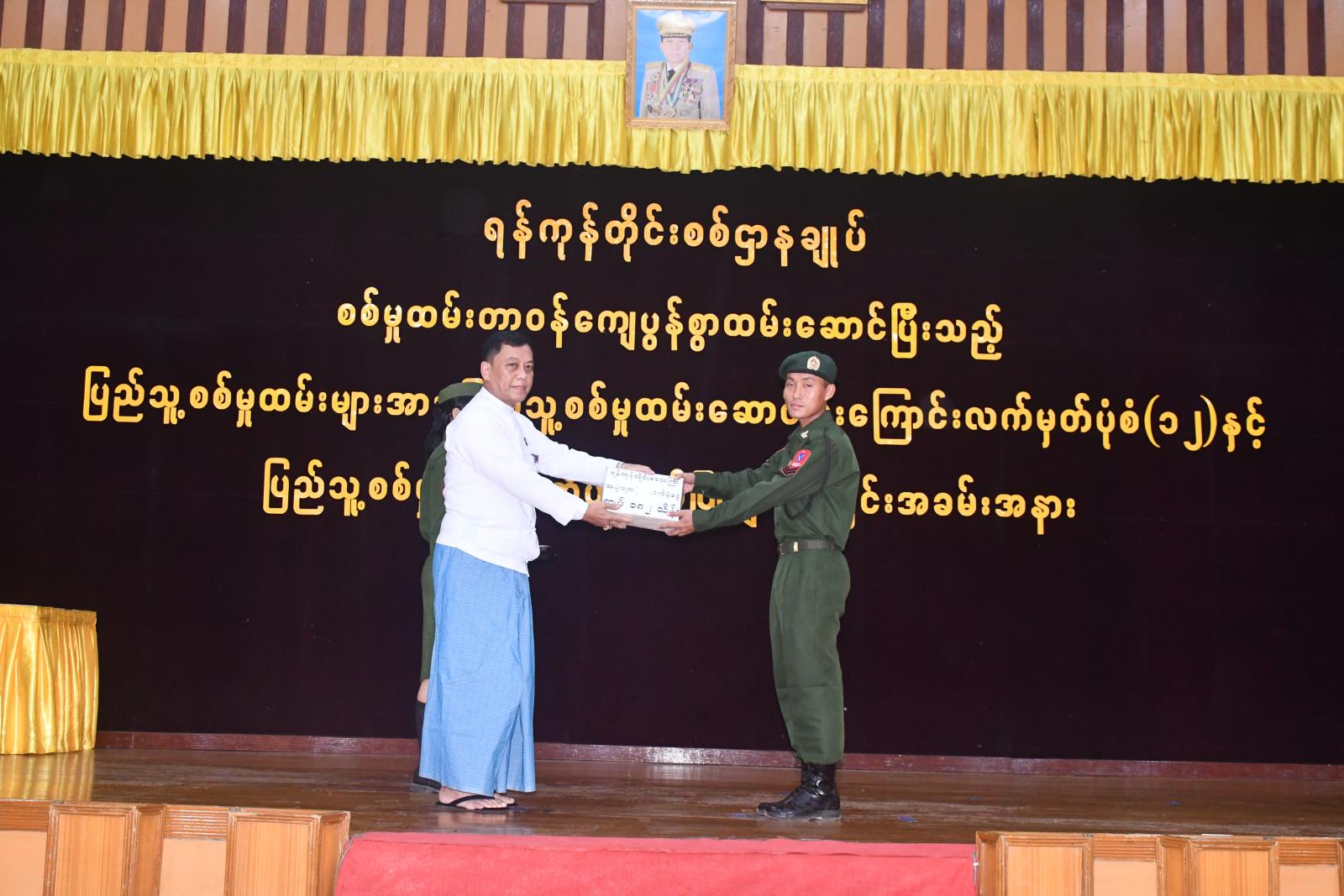 ဦးစွာ ရန်ကုန်တိုင်းစစ်ဌာနချုပ် တိုင်းမှူးဗိုလ်မှူးချုပ် တင်မင်းလတ်က ဂုဏ်ပြုအမှာစကား ပြောကြားသည်။ ဆက်လက်၍ တိုင်းမှူးနှင့်တာဝန်ရှိသူများက စစ်မှုထမ်းတာဝန်ကျေပွန်စွာ ထမ်းဆောင်ပြီးသည့် ပြည်သူ့စစ်မှုထမ်းများအား ပြည်သူ့စစ်မှုထမ်းဆောင်ပြီးကြောင်း လက်မှတ်ပုံစံ (၁၂)နှင့် ပြည်သူ့စစ်မှုထမ်းတံဆိပ်များ ပေးအပ်ချီးမြှင့်သည်။