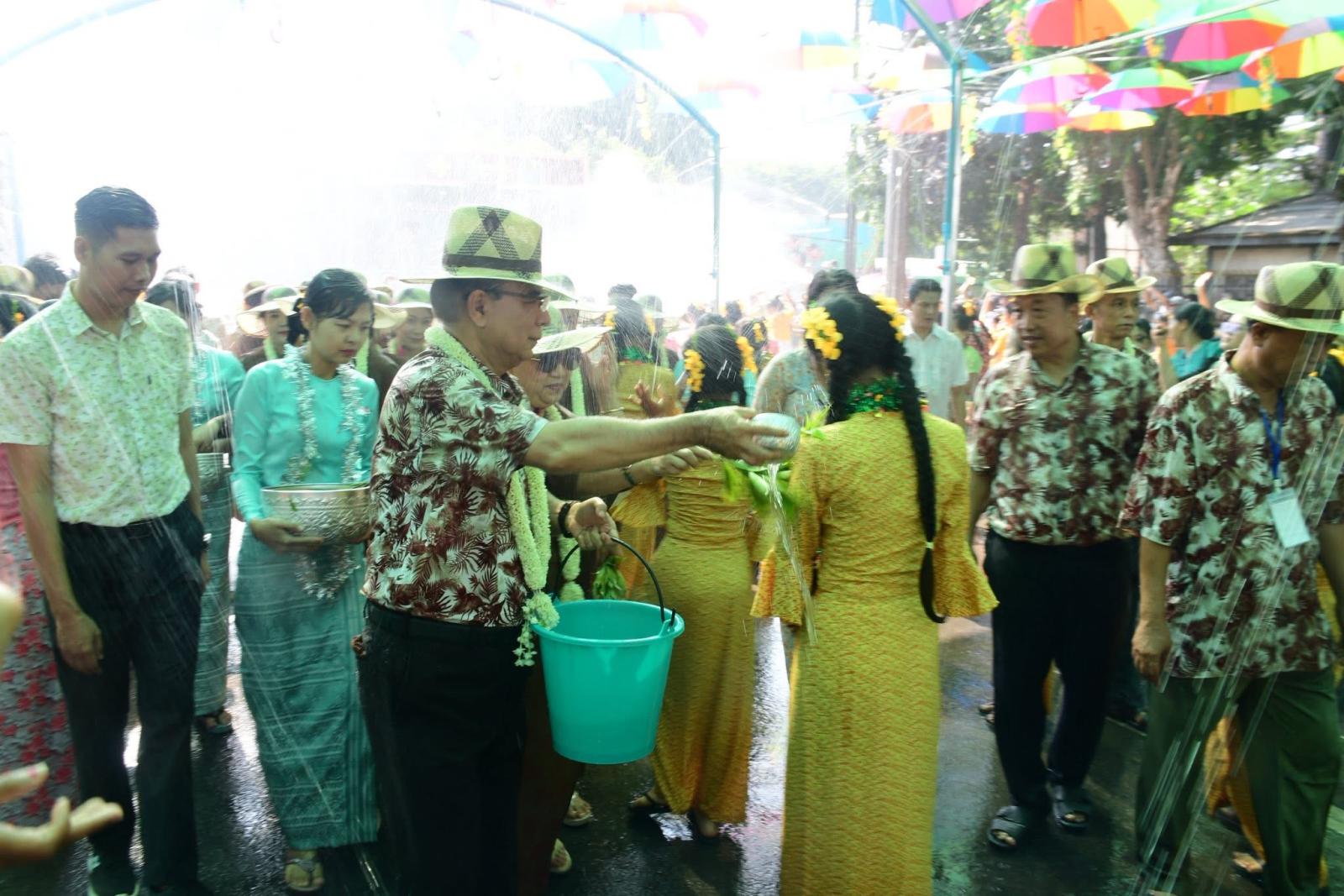 ဦးစွာ တိုင်းဒေသကြီးဝန်ကြီးချုပ်က သင်္ကြန်ဟူသောစကားသည် ပါဋ္ဌိစကားမှ ဆင်းသက်လာပြီး ပြောင်းလဲခြင်း၊ ကူးပြောင်းခြင်းဟု အဓိပ္ပါယ်ရကြောင်း၊ မြန်မာတို့ရဲ့ နှစ်သစ်ကူးသင်္ကြန် အချိန်အခါတွင် အတာရေပက်ဖျန်းပေးခြင်းဖြင့် အေးမြကြည်လင်ခြင်း၊ အညစ်အကြေးတို့ကို ဆေးကြောခြင်းနှင့်အတူ တစ်ဦးနှင့်တစ်ဦး မေတ္တာသက်ဝင်ချစ်ခင်ခြင်း၊ စည်းလုံးညီညွှတ်ခြင်းကိုဖြစ်စေနိုင်ပြီး မြန်မာနိုင်ငံသားတို့၏ ရိုးရာဓလေ့ပွဲတော်များအနက် ထူးခြားလေးနက်မှုရှိသည့် ပွဲတော်တစ်ခုဖြစ်ကြောင်း၊ မဟာသင်္ကြန်ကာလအတွင်း ရေသဘင်ပွဲဆင်နွှဲရုံသာမဟုတ်ဘဲ ကောင်းမှုကုသိုလ်များပြုလုပ်ခြင်း၊ သက်ကြီးရွယ်အိုများပြုစုခြင်း ပူဇော်ကန်တော့ခြင်း၊ စတုဒီသာအလှူဒါန များပြုလုပ်ခြင်းနှင့်အတူ ဇီဝိတ ဒါနအဖြစ် တိရစ္ဆာန်များကို ဘေးမဲ့လွှတ်ခြင်းစသည့် စေတနာသဒ္ဓါတရား ပြည့်ဝစွာ ပြုလုပ်သည့်ဓလေ့များလည်းပါဝင်ကြောင်း၊ မြန်မာ့ရိုးရာသင်္ကြန်ပွဲတော်ဆင်နွှဲရာတွင် ရိုးရိုးသားသား ပျော်ရွှင်မှုမျိုးသာဖြစ်စေရန်နှင့် ရိုးရာယဉ်ကျေးမှုကို ပျက်စေသည့် အပျက်သဘောမျိုးမဖြစ်စေအောင် ယနေ့လူငယ်များ ထိန်းသိမ်းကြရမှာဖြစ်ကြောင်း၊ ယခုလို ကျက်သရေမင်္ဂလာရှိတဲ့ နှစ်သစ်ဦးအချိန်ကာလ အခါသမယမှာ ဖြတ်သန်းခဲ့ရတဲ့ နှစ်ဟောင်းမှ မကောင်းမှုများနှင့် စိတ်နှလုံးအညစ်အကြေးတို့ကို အတာရေနှင့်အတူ ဆေးကြောသန့်စင်နိုင်ကြပါစေကြောင်းနှင့် တိုင်းဒေသကြီးကောင်းကျိုးအတွက် အစိုးရနှင့်ပြည်သူ လက်တွဲညီညီဖြင့် လက်တွဲဆောင်ရွက်ကြစေလိုကြောင်း နှုတ်ခွန်းဆက်အမှာစကား ပြောကြားသည်။